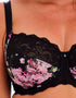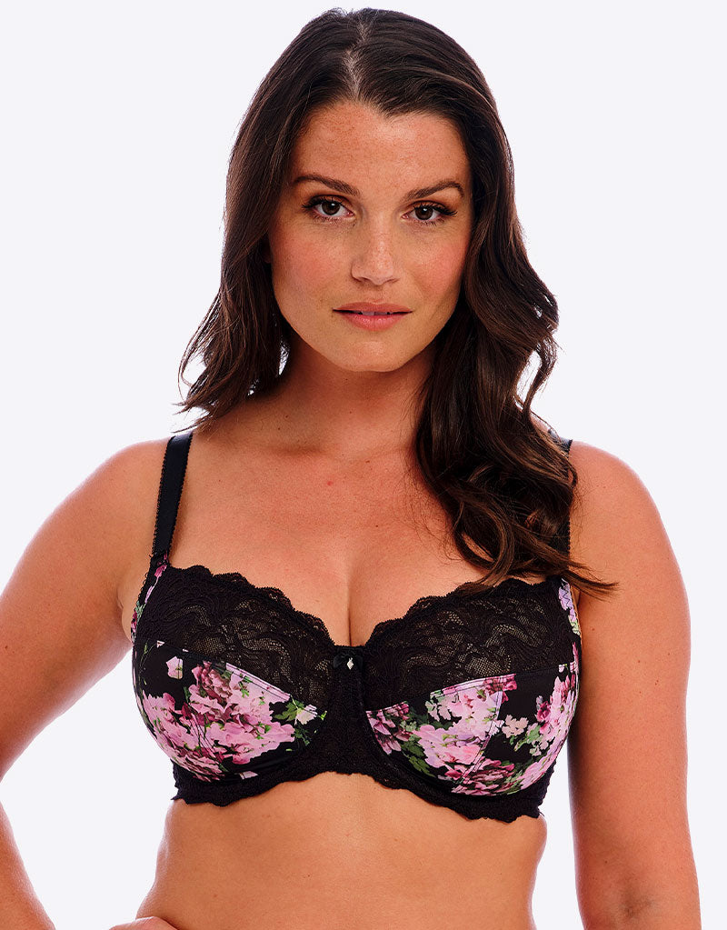 The Lucia side support bra from Fantasie is stunning in black with a sweet pea floral print. This well-loved, bestselling side support cup shape offers good everyday coverage with side panels that give your bust a fantastic forward shape, with uplift and support for fuller busts. Styled in an opaque, non-stretch fabric with lace top cups for a lightweight feel.
