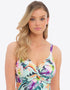 The Fantasie Paradiso twist front swimsuit ticks all our boxes - style, support and comfort - in soft mint green and bold tropical print. Concealed underwire cups support your bust without compromise and offers a sleek look, with twist front detail and a subtle plunge neckline. Adjustable tie sides allow you to raise or lower the leg line to your preference, while the low scoop back keeps it feeling classic and easy to wear.