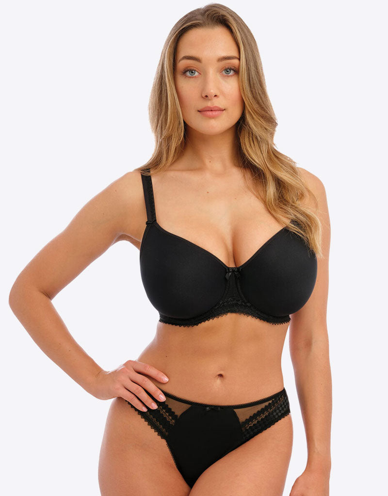 The Fantasie Rebecca spacer bra is perfect for everyday wear in Black. Showcasing a lightweight and breathable seamless foam cup that gives a smooth, rounded shape under clothes without adding bulk or volume to your bust, with a fuller coverage shape and wide wires. Trimmed with pretty geometric embroidery detailing along the cradle to finish the look.