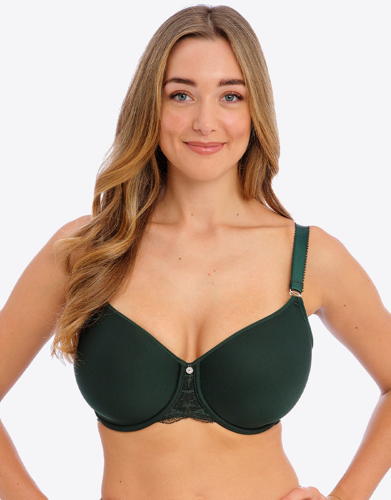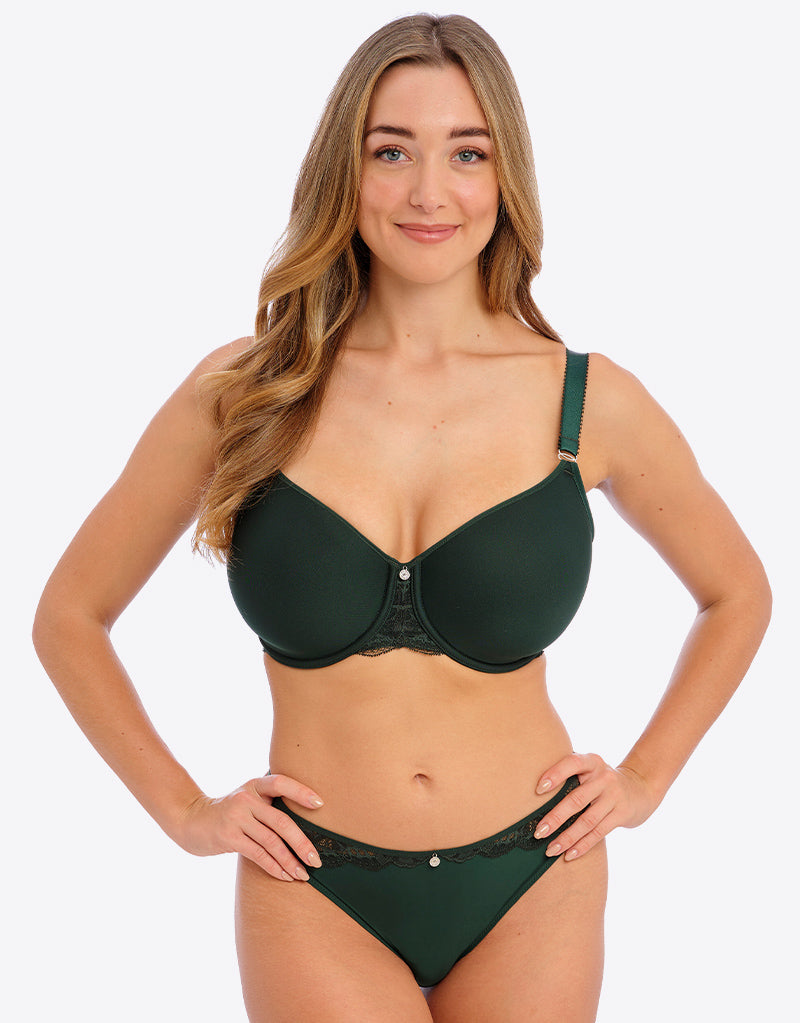 For a smooth fit under clothes, try the Fantasie Reflect moulded spacer bra. This deep emerald green is perfect for adding some colour while remaining practical and easy to wear, in a lightweight and breathable spacer foam fabric. A bandless shape ensures upper tummy comfort, particularly great for those with shorter torsos, trimmed with pretty lace detail.