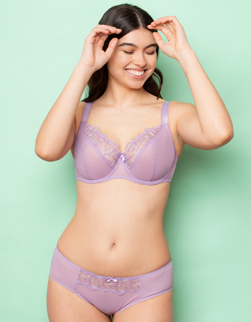 The bestselling Flirtelle Alice balcony bra is back in a gorgeous lilac hue, perfect for warmer days. Made from a breathable mesh, the double layer bottom cups ensure fantastic uplift and support with delicate top cup embroidery for an elegant finish. Brushed-back, wide shoulder straps offer total comfort, with a firm mesh underband for all-day hold.