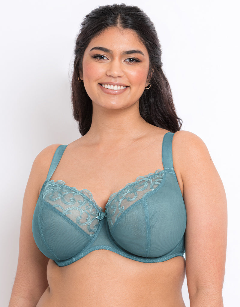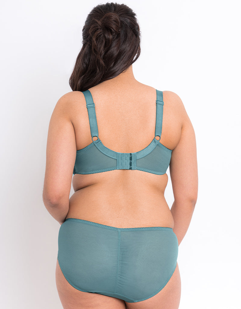 We can't get enough of the Flirtelle Alice balcony bra, and she's back in a beautiful new mineral blue shade! Made from soft, sheer mesh with double layered bottom cups to reinforce the support and uplift, and a delicately embroidered top cup to keep it pretty. Finished with non-slip, 22mm wide shoulder straps and a gently elasticated mesh back band.