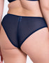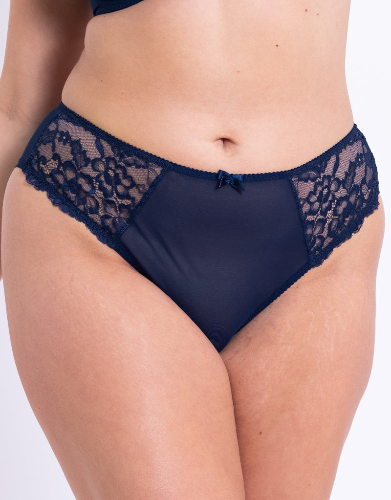 The Flirtelle Chloe brazilian brief is gorgeous in navy blue, offering something a little different for everyday style. Soft mesh and stretch lace provide a comfortable fit, with a low rise waist and higher leg, cut with medium overall coverage.