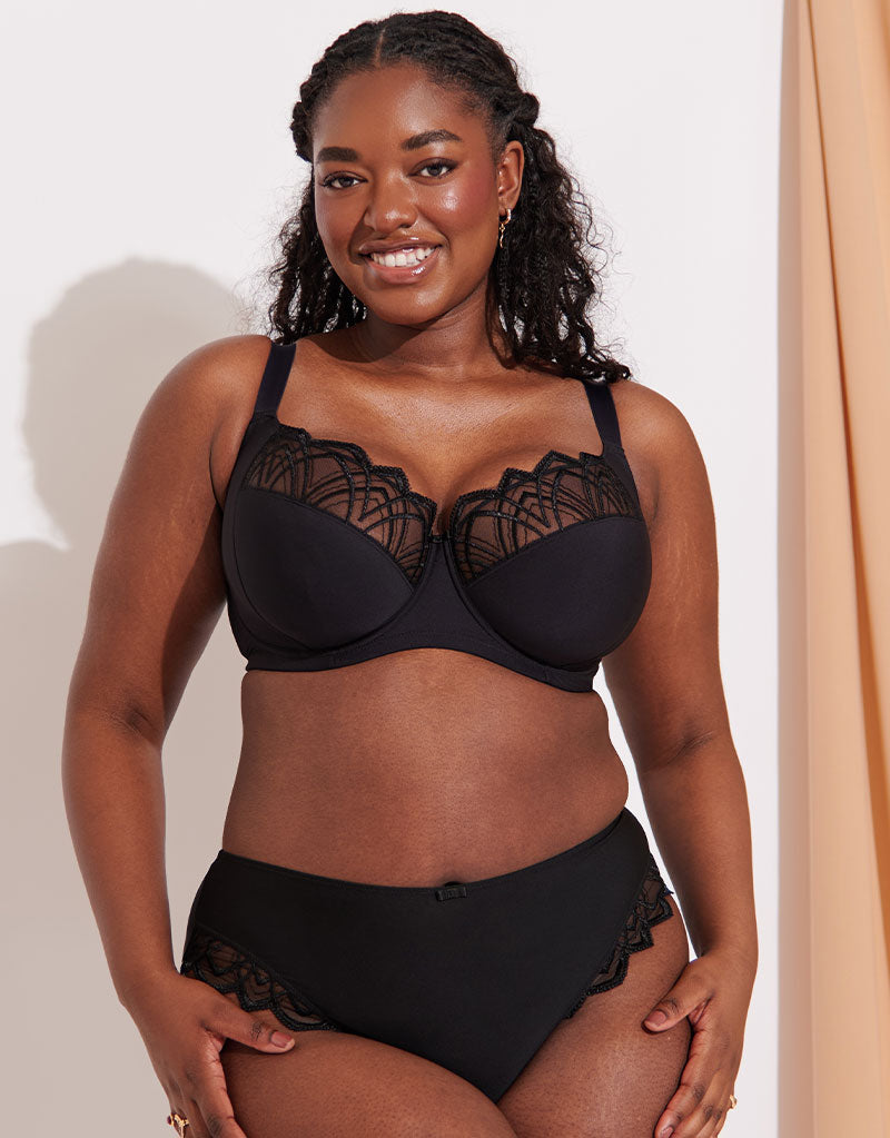 Introducing Emilie Deco, a gorgeous Art Deco inspired take on our bestselling Flirtelle Emilie full cup bra with a statement-making top cup embroidery. Styled in classic black, this easy to wear everyday bra offers a reliable fit and support up to a K cup thanks to the uplifting mesh and soft fabrics. Cut in a fuller coverage cup shape with side support panels for forward projection.