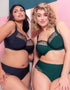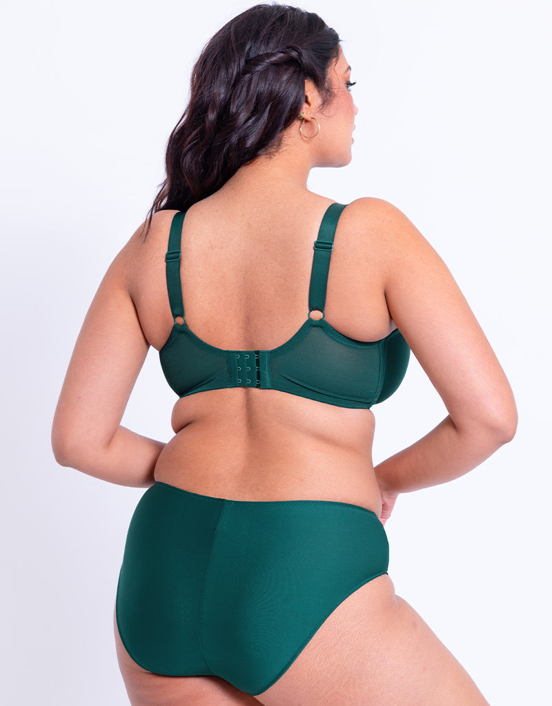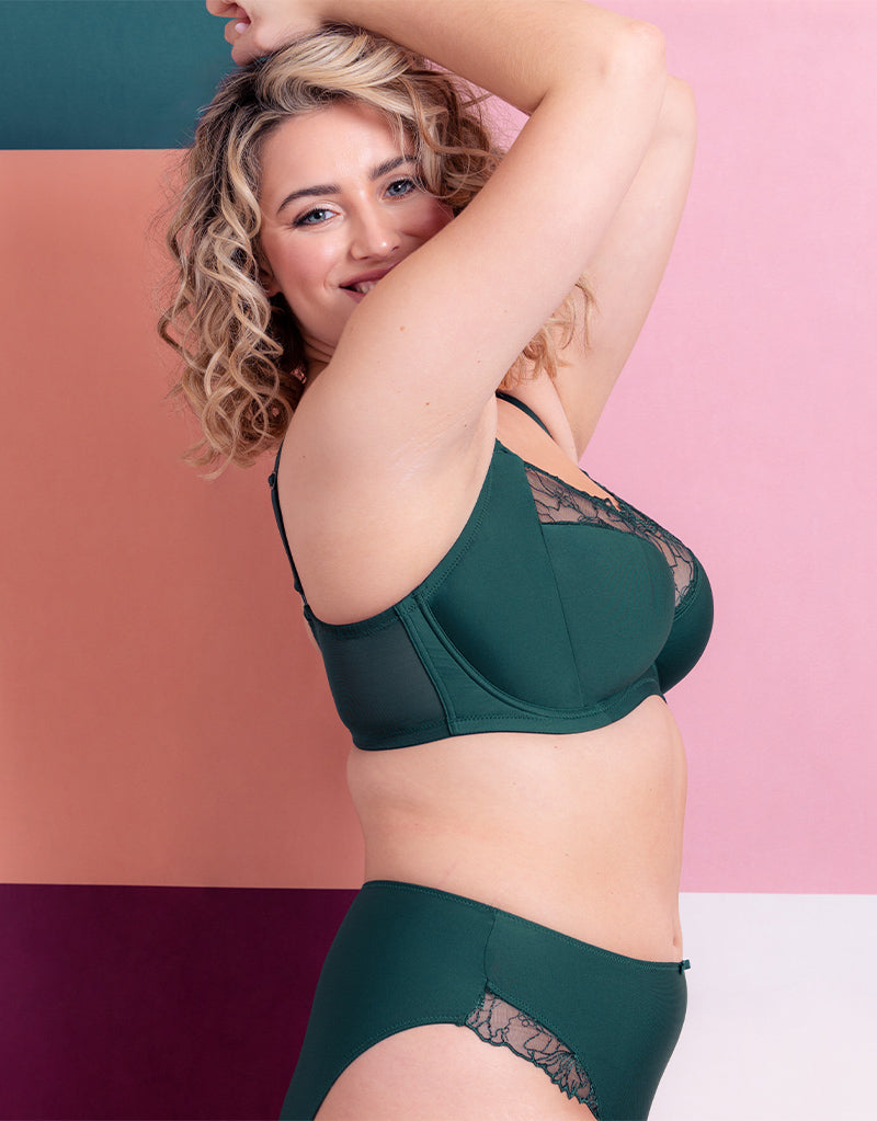 For reliable fit, support and comfort up to a K cup, choose the Flirtelle Emilie full cup bra. Now available in a beautiful spruce green, this fuller coverage option ensures your bust is secure day to day. 4-part cups use a side panel to give forward projection, with a sturdy mesh inner cup that keeps its shape. Overlaid with a soft microfibre for a smooth, soft feel and trimmed with floral embroidery on the top cup to keep it pretty.