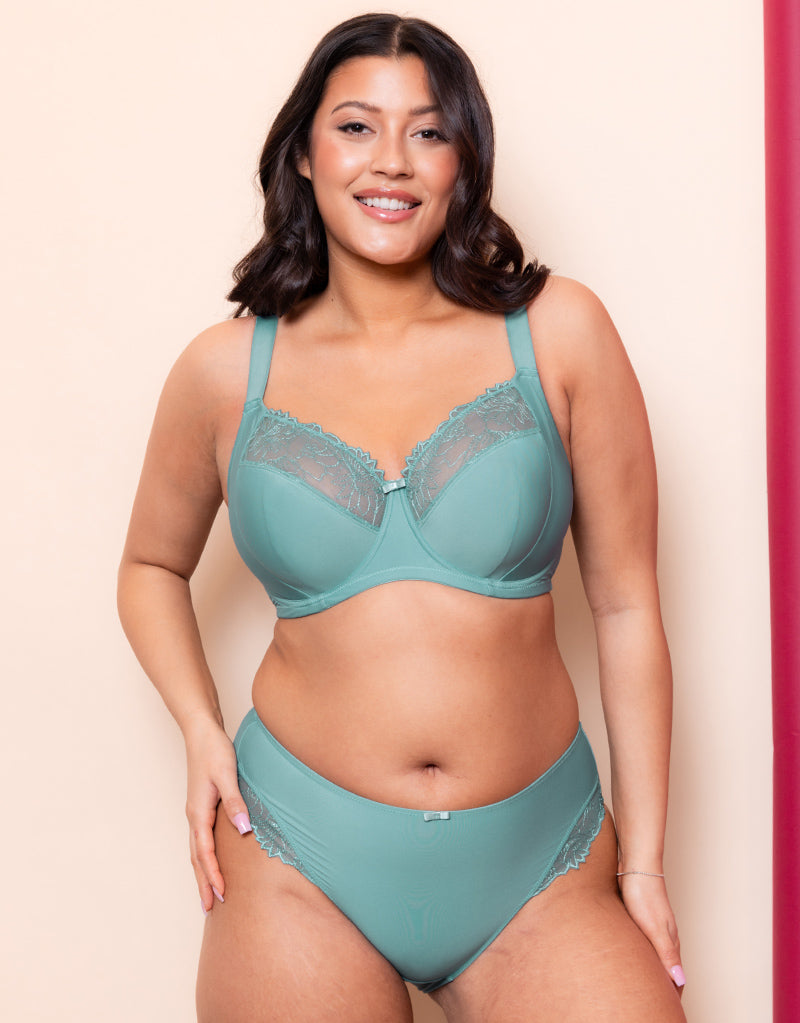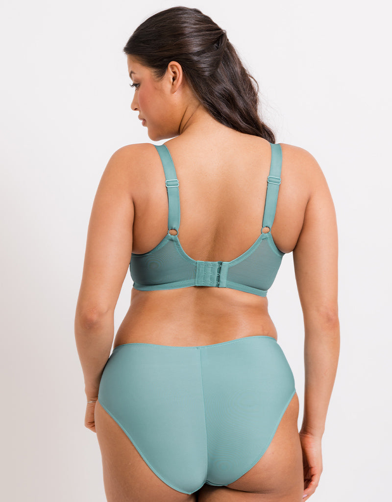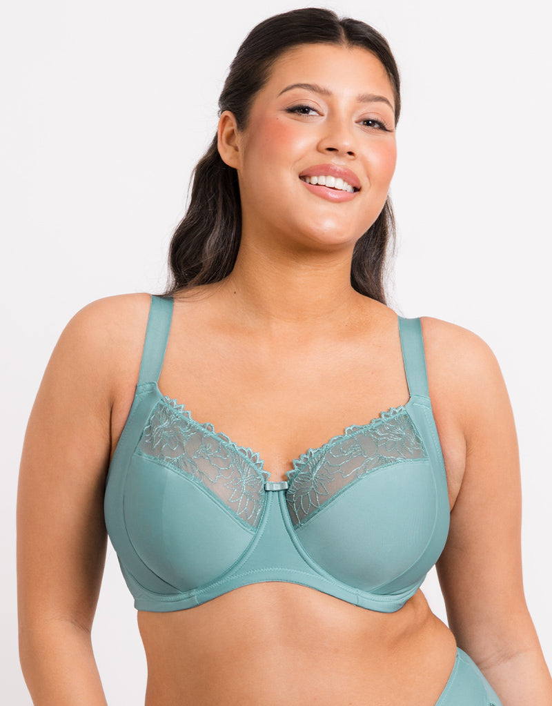 We LOVE the Flirtelle Emilie full cup bra thanks to the fuller coverage shape with reliable fit, support and comfort up to a K cup. AW24 welcomes a soft mineral blue to the range, with non-padded, 4-part cups using a side panel to give forward projection. A supportive mesh lining provides shape and support, while a soft microfibre outer fabric gives a smooth, soft feel. Delicate top cup embroidery lightens the look and keeps it feeling feminine and pretty, with fully adjustable straps to finish.