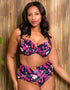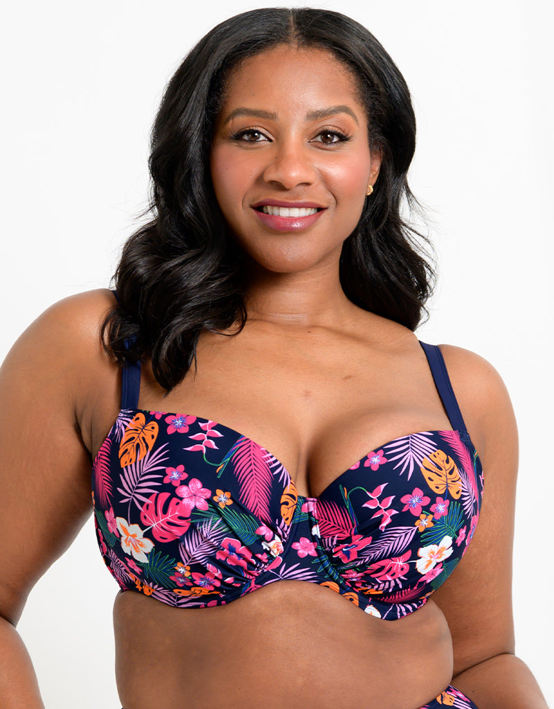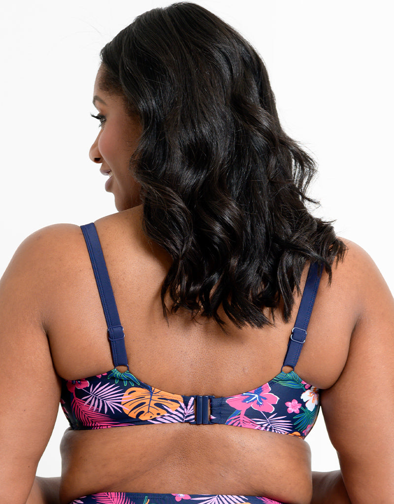 Make a statement in the Hawaii Sands bikini top from Flirtelle! This chic tropical leaf print adds pops of colour to the navy base, offering fantastic fit and comfort with foam lined, underwired cups and powermesh lined wings. Offering uplift through to a K cup while maintaining its shape even when wet, you can enjoy your holiday knowing your bust is secure and supported!