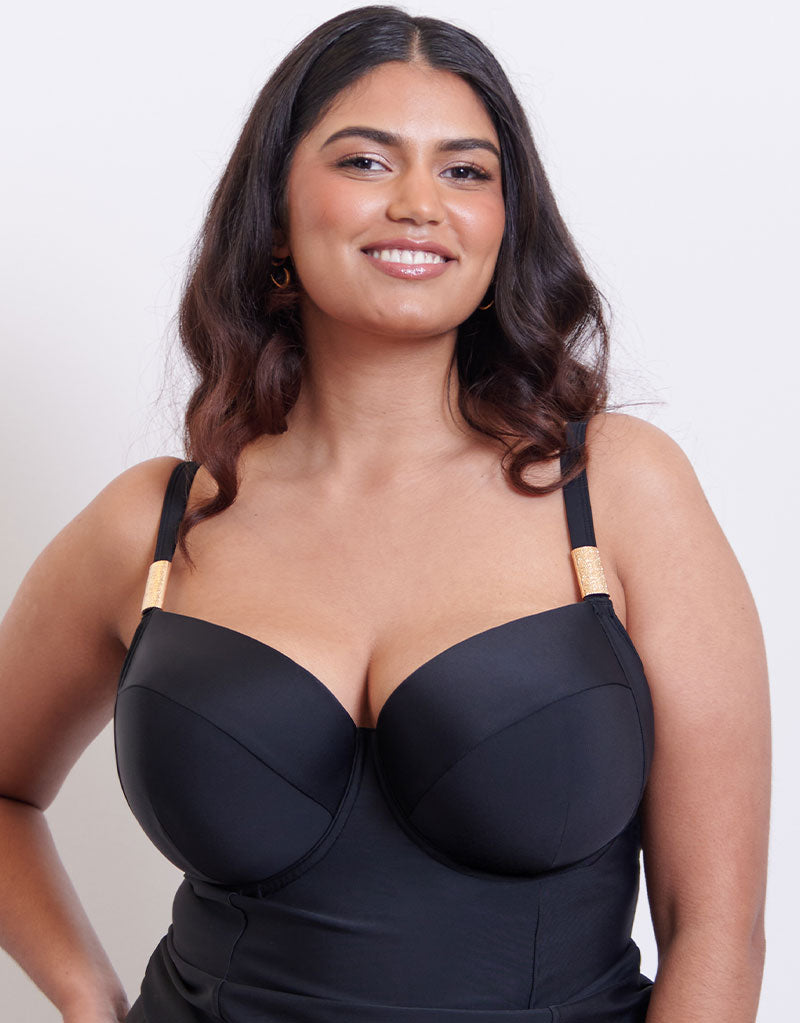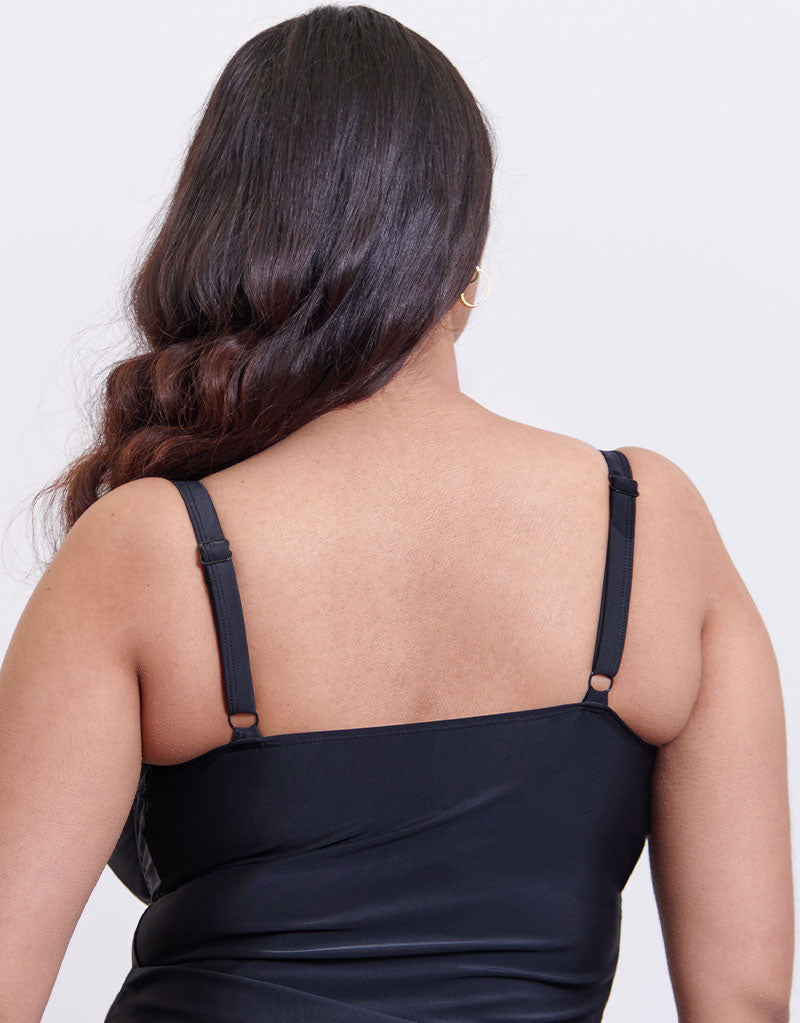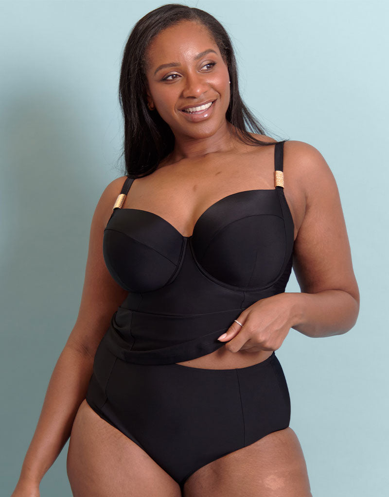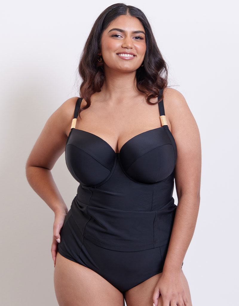 The Flirtelle May Bay tankini top is the perfect choice for those who want the fuller coverage of a swimsuit, but the versatility of a bikini. In easy to wear, classic black it ticks all the boxes for any holiday! Foam lined, underwired cups ensure total support for fuller busts both in and out of the water, with a stylish metallic detail to the straps.