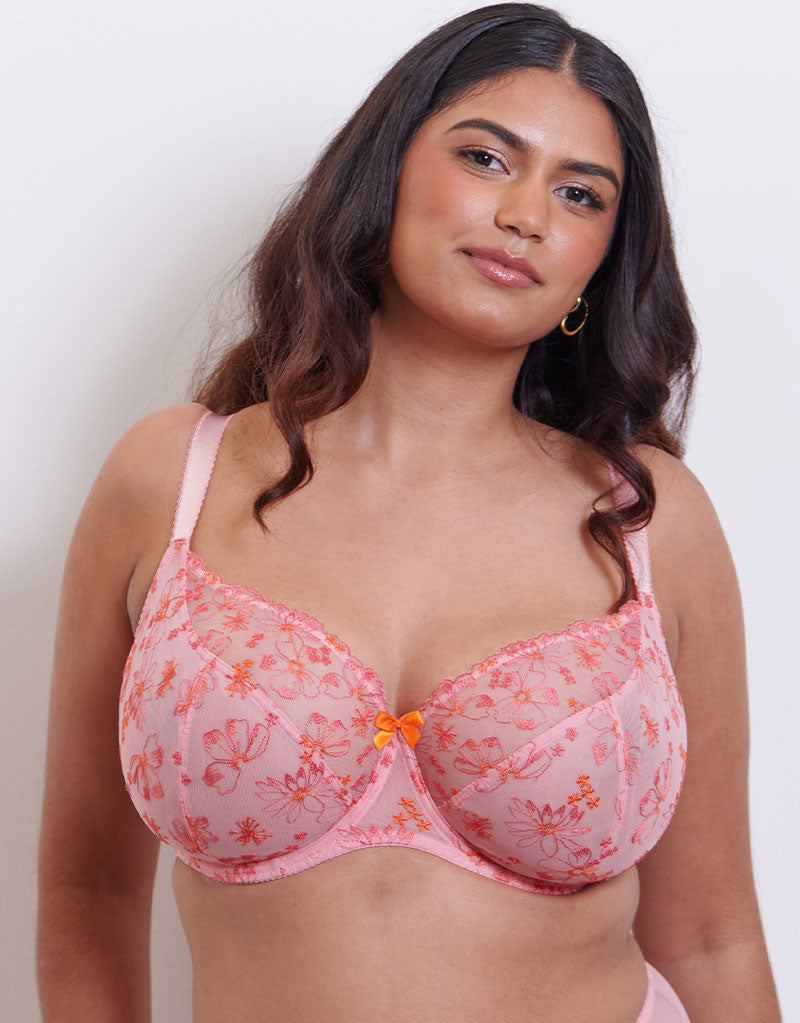 Be pretty in pink with the Flirtelle Rosie balcony bra. This everyday shape is designed to uplift and support through to a K cup with medium coverage for all day comfort, in a traditional 3-part cup design. Made from soft pink mesh with pops of pink and orange tonal embroidery and bow detail to keep it feeling sweet and feminine, complete with a mesh liner in the bottom cup to reduce the sheerness and increase support.