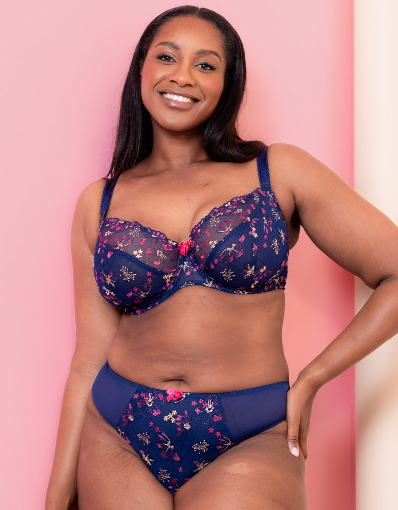 Flirtelle's Rosie brazilian brief is super sweet in navy blue with two-tone embroidery detail on the front panel. This classic brazilian shape offers a comfortable fit with a cheekier bottom cut, and an added mesh lining in the front panel for modesty.
