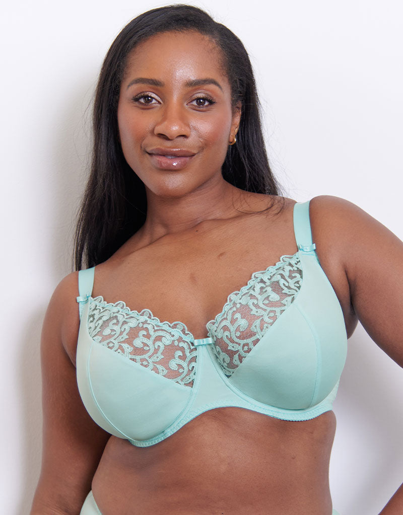 Shop our incredible Flirtelle Swirl balcony bra in a fresh spearmint blue! This bestselling, firm favourite style gives fantastic fit and support through to a K cup, made from a non-stretch mesh to lift and shape and trimmed with a pretty swirled embroidery panel to the top. The smooth microfibre outer keeps it sleek and soft, sitting perfectly under clothing.