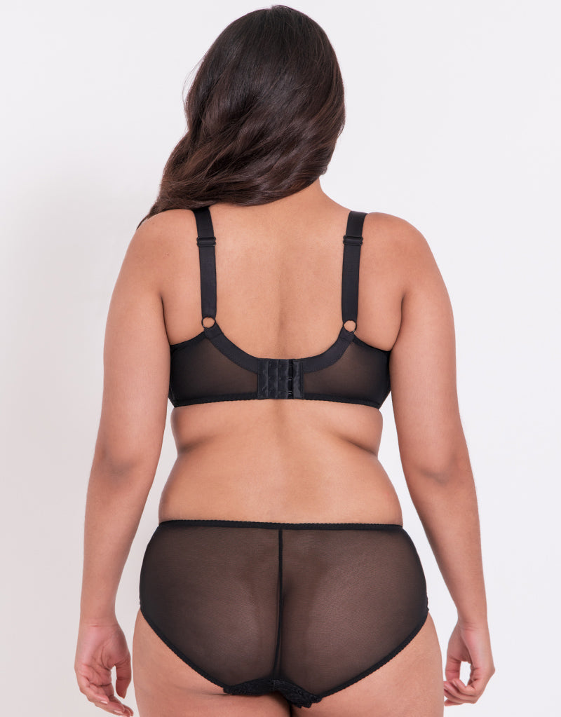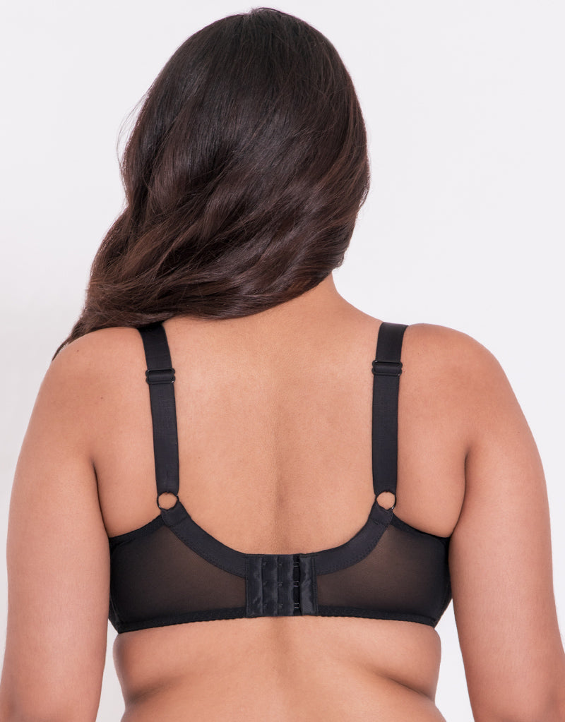 Classic everyday style is yours with the Flirtelle Viola balconette bra in black. Sophisticated dot mesh meets ultra-soft stretch lace, creating a comfortable fit that moulds uniquely to you. Perfect for asymmetrical breasts, with mesh lining in the bottom cups to provide great shape and lift up to a K cup.
