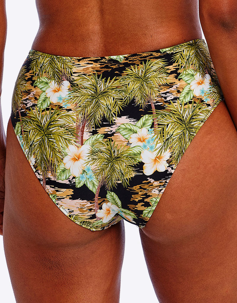 The Freya Bahama Shores high waist bikini brief is beautiful with tropical palm and hibiscus print on a black base. Offering a fuller coverage fit with a high rise waistline, with a scooped leg line and full lining for comfort.