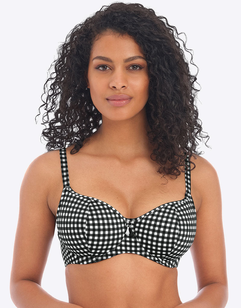 Go retro with the Freya Check In sweetheart bikini top! A chic black and white gingham meets a flattering sweetheart neckline with a thin foam lining to the cups to give great shape and uplift. Perfectly supportive for your next getaway!