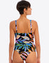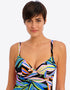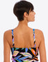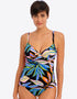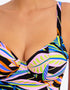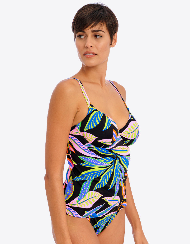 The Desert Disco tankini top from Freya is the perfect choice for those who want the coverage of a one-piece, but the convenience of a bikini! Gently plunging cups are non-padded with a supportive mesh lining, and underwired to give uplift and shape. Styled in black with a blend of neon hues in a tropical leaf print.