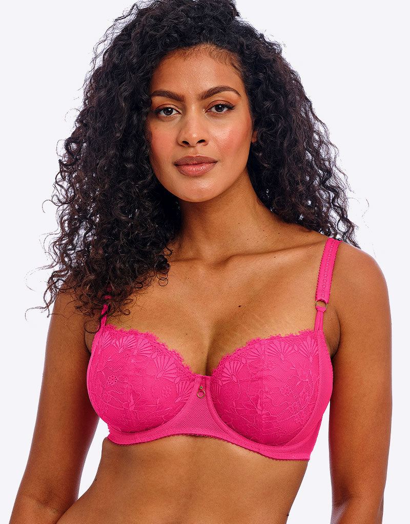 Freya Fascinate brings a pop of colour to your lingerie drawer in a hot pink colour. The balconette bra showcases a stunning floral lace design with a flirtatious eyelash lace neckline, and is fully lined with a second layer of mesh. Vertical cup seams and an outer side support sling ensure your bust is uplifted and supported, giving great shape that's perfect under a square neck top.