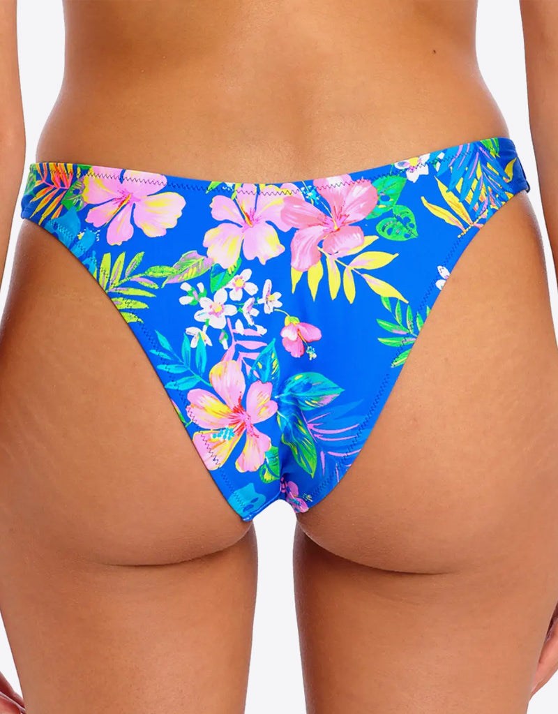 Freya's Hot Tropics high leg bikini brief completes the set effortlessly in bold blue with tropical hibiscus print. This classic bikini bottom offers lower coverage and total comfort thanks to the fully lined design, with a higher, scooped leg line for flattering effect.