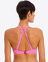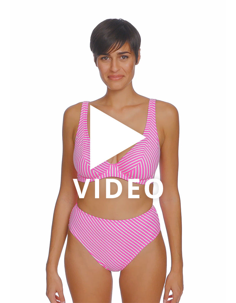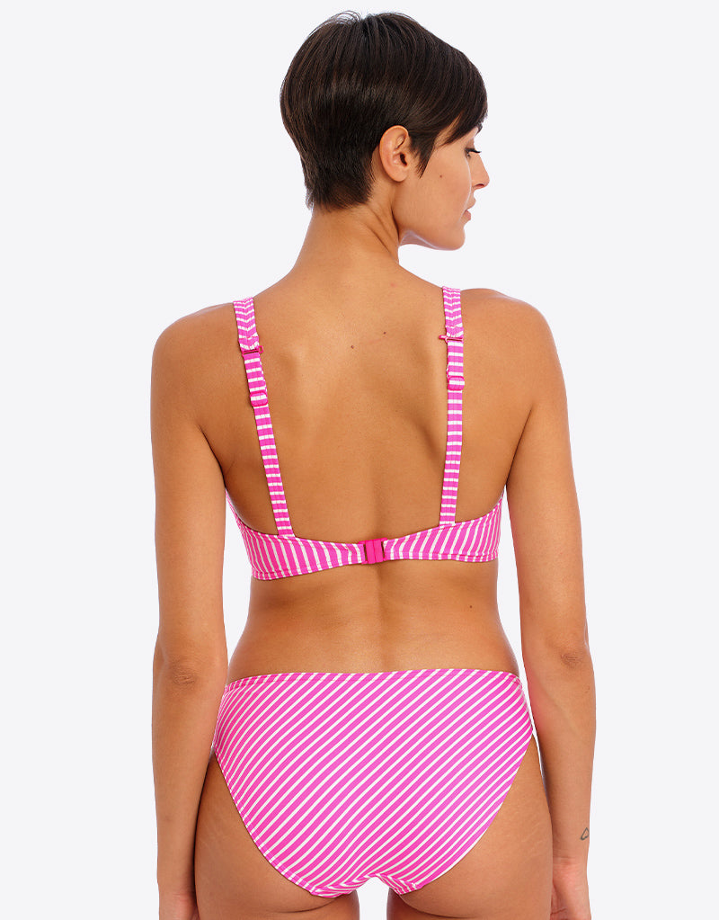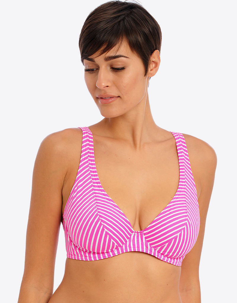 Freya's Jewel Cove high apex bikini top is oh-so-sweet in a raspberry and white stripe. The high apex cup shape and low centre front highlights your cleavage, and gives a plunging neckline while still feeling secure and comfortable. A J-hook at the back allows you to clip it into racerback.