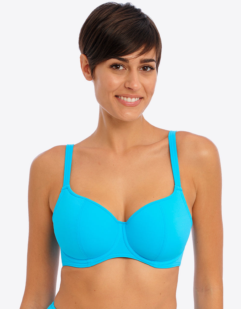Brighten up your days with the Freya Jewel Cove sweetheart bikini top in bold turquoise. This simply designed bikini top has no fuss or frills, just comfort and modern style in mind. Foam lined cups provide support and a rounded shape without adding bulk, with a sweetheart neckline that gives your bust a subtle boost.
