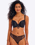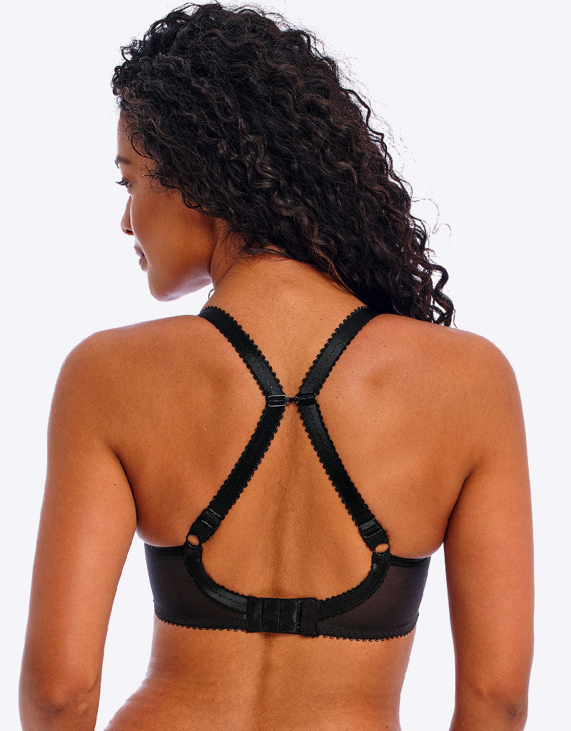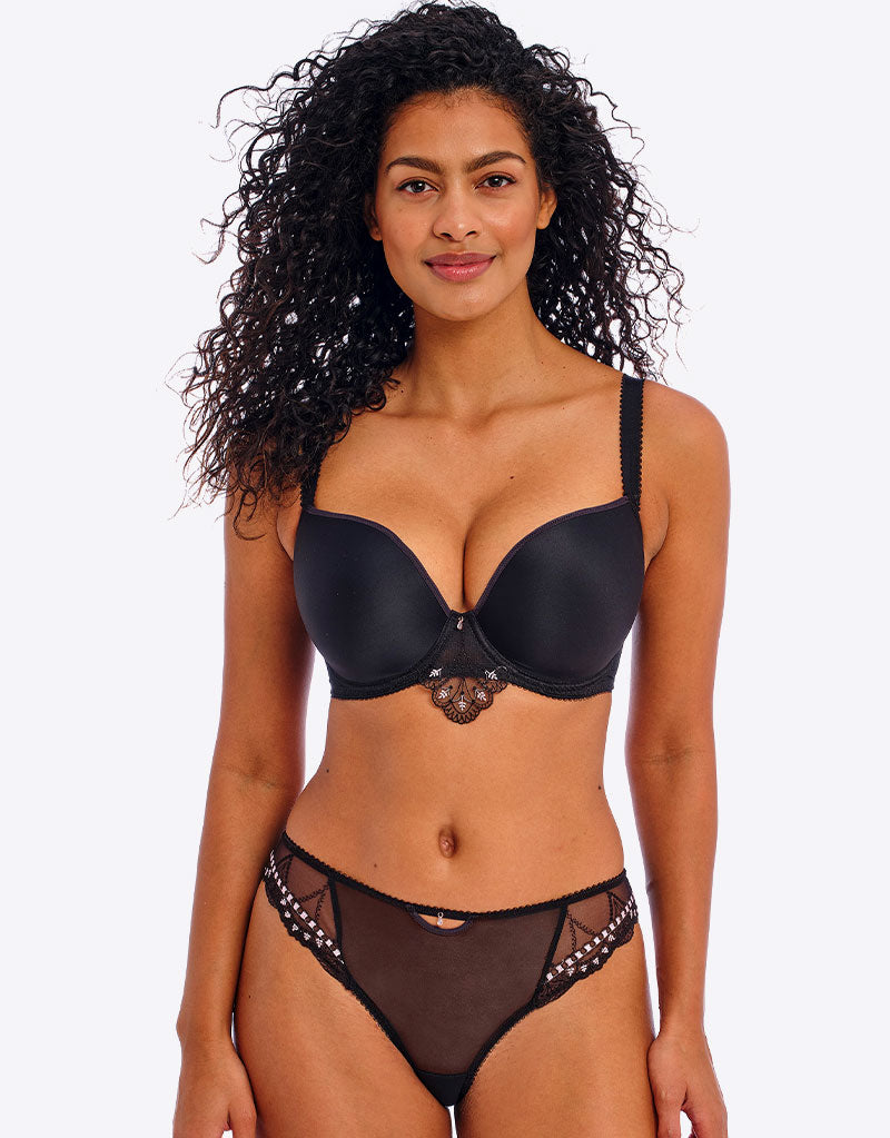 Freya's Loveland moulded plunge bra is stunning in Boudoir Black. With seamless, foam lined cups it gives your cleavage a boost and a smooth, rounded shape under clothes. In all-black its easy to wear day to day, but is elevated by a pretty embroidered motif at the centre front to add elegance and charm. Complete with fully adjustable shoulder straps and a sliding J-hook to wear in racerback position.