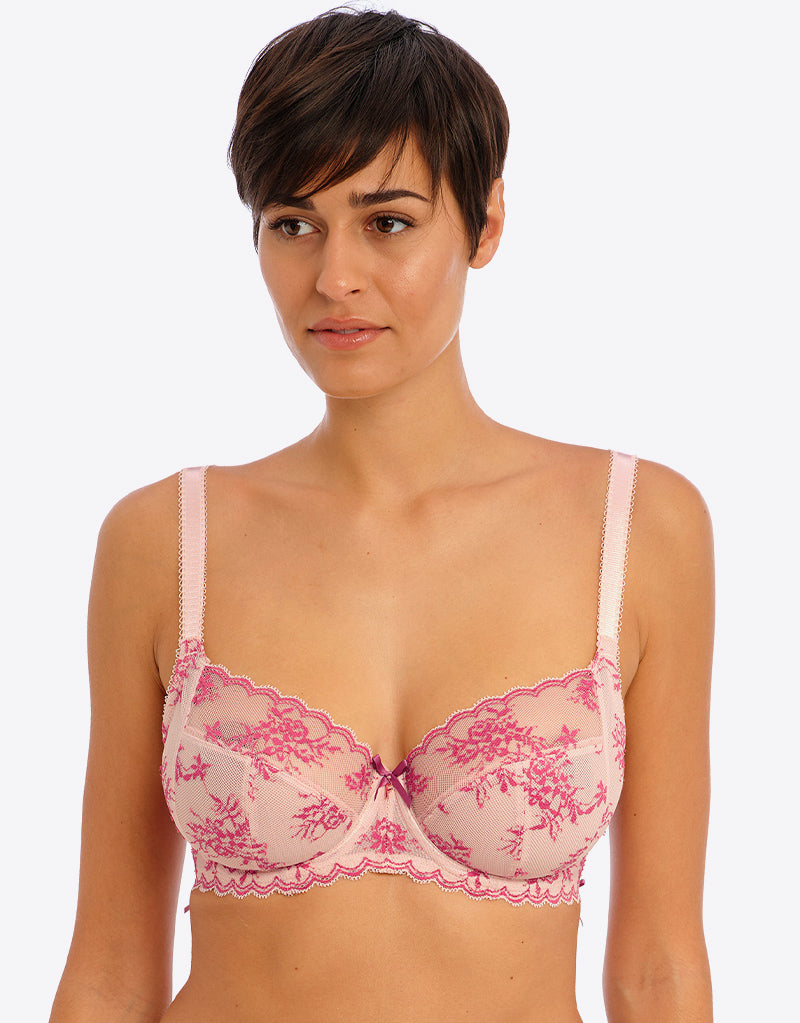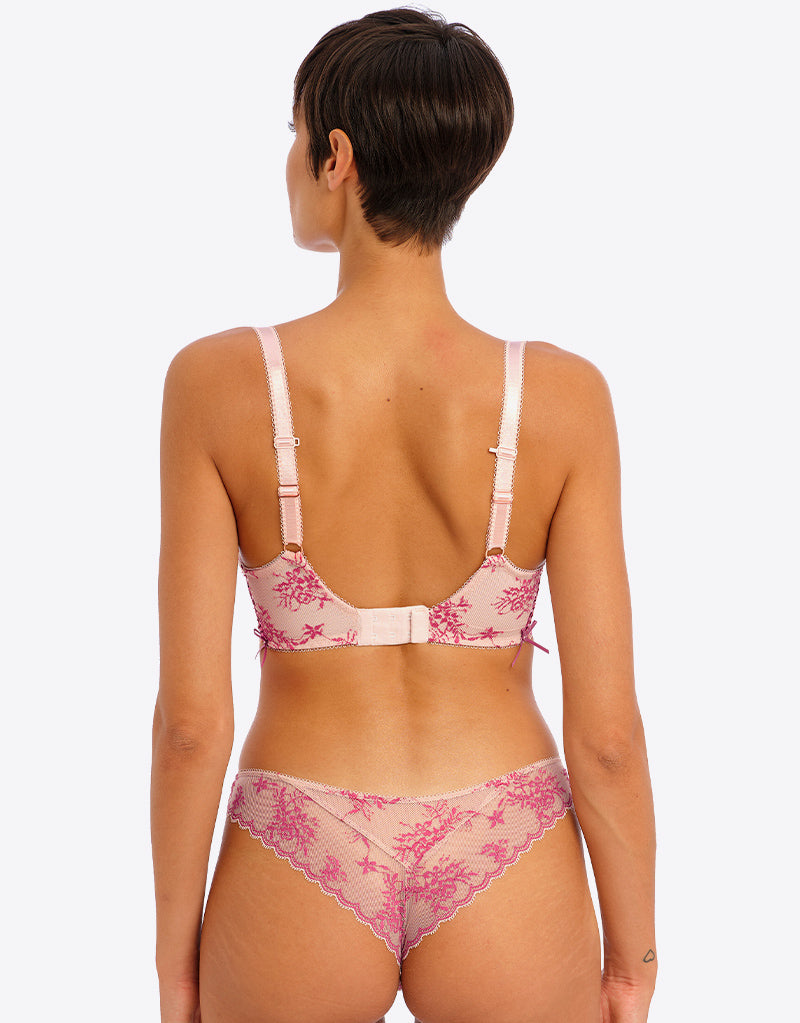 Introducing the Freya Offbeat Decadence side support bra in a soft Vintage Rose colourway. Bringing romantic vibes to your everyday lingerie, this best-selling side support shape offers fantastic forward projection for a streamlined silhouette under clothes, and stretch lace for a flexible fit. Finished with faux lace up detail on the sides for boudoir style, and a J-hook option to give a racerback shape.