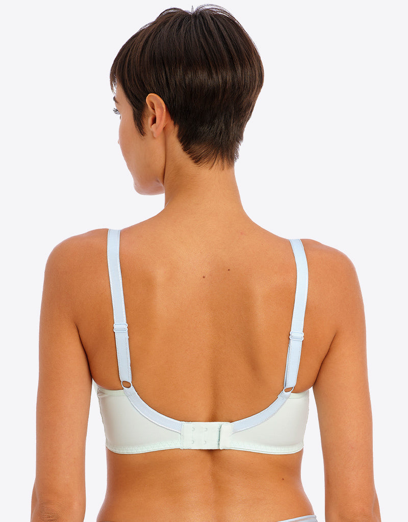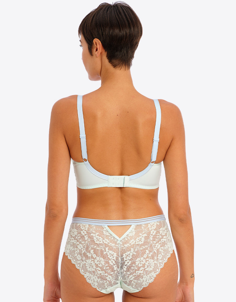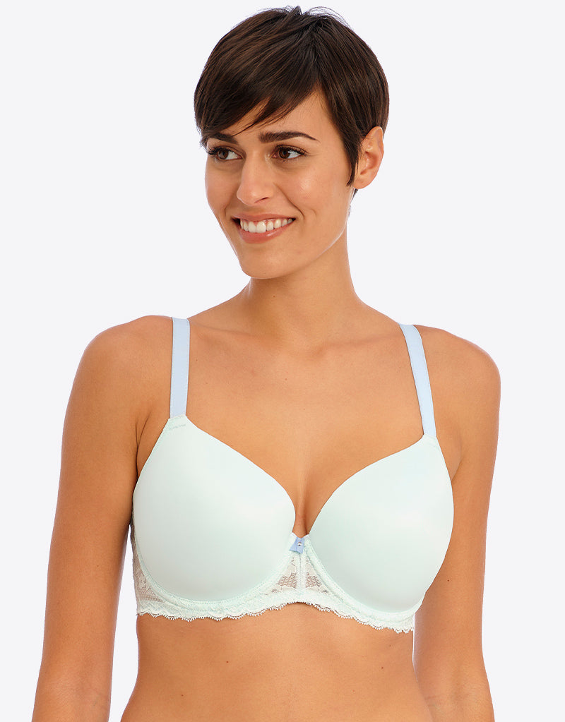 Freya's Offbeat moulded plunge bra is gorgeous in this pastel Pure Water Blue. Smooth, seam-free cups give a sleek appearance under clothes and feel gentle against sensitive skin. Designed to give a rounded, uplifted shape without adding extra volume to your bust. Complete with pretty lace detail to the underband and contrasting black edging and straps.