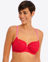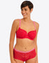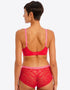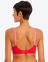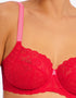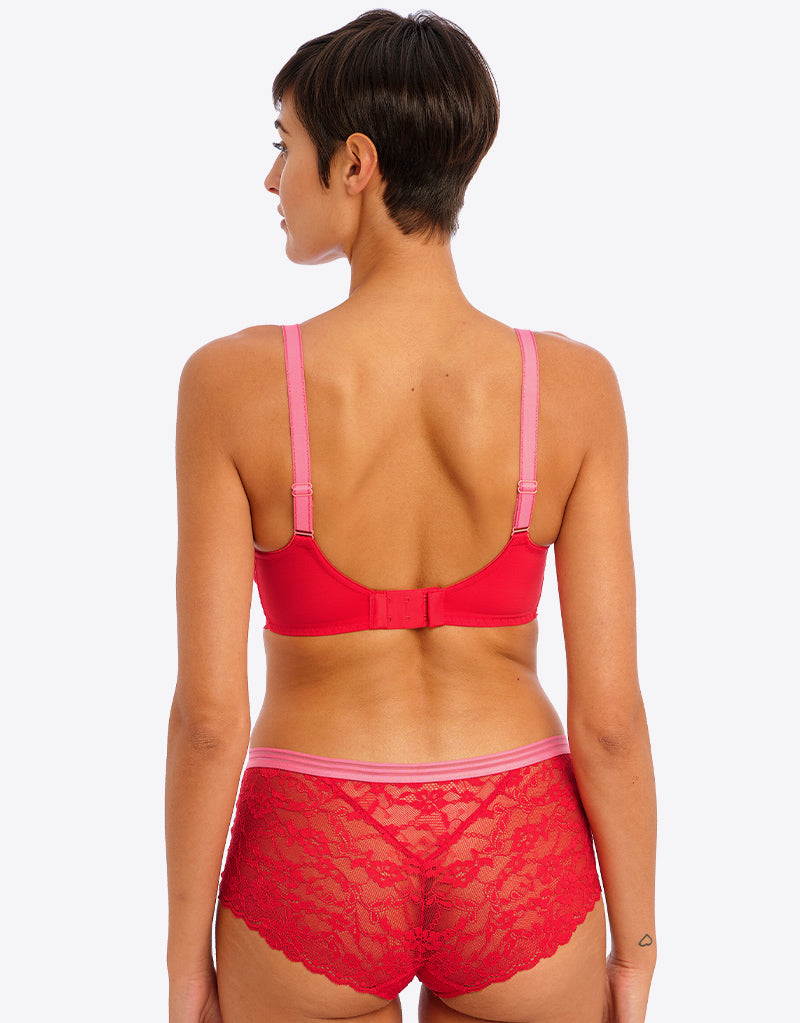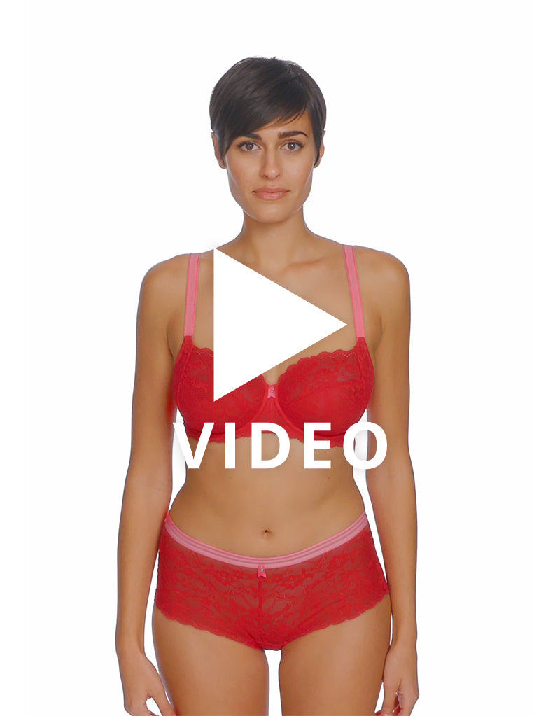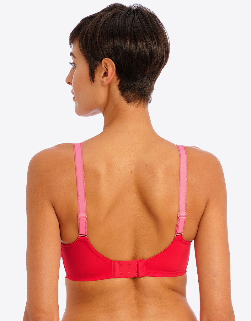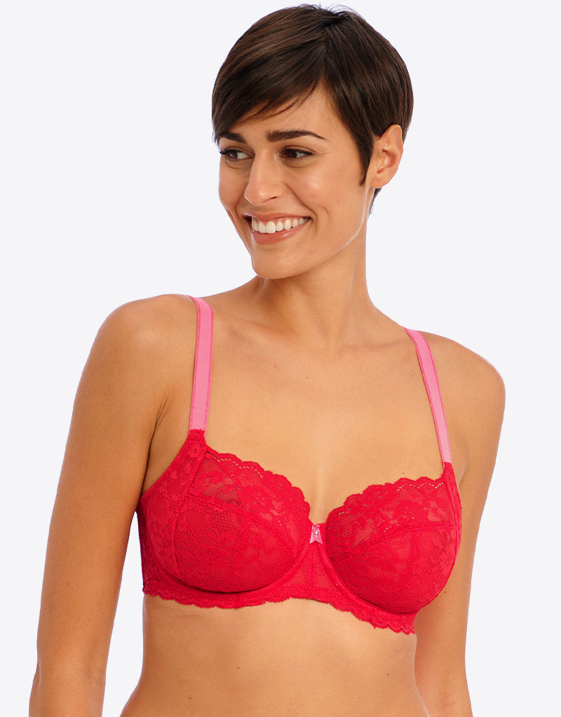 Freya's Offbeat side support bra is super sassy in a chilli red colourway, with contrasting pink straps. The side support shape boasts a laminated 4-part cup that gives your bust great forward projection and uplift, while stretch lace top cups offer an ease of fit that's perfect for those with full-on-top shapes or asymmetrical breasts.
