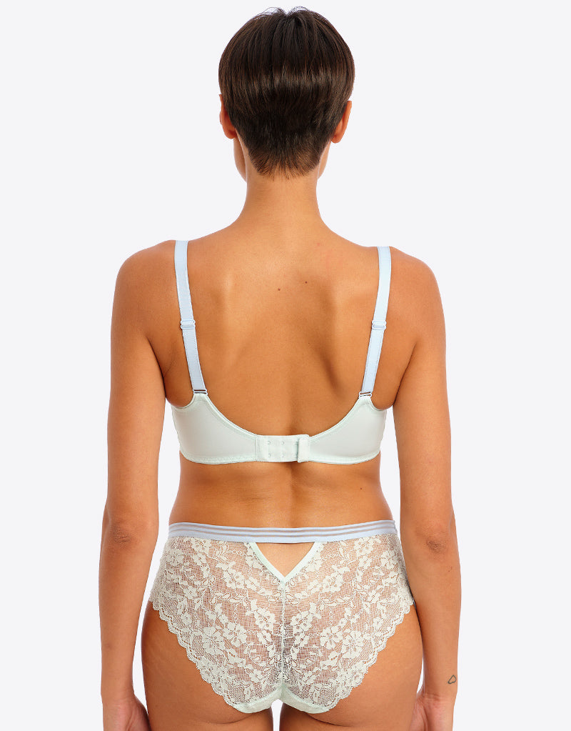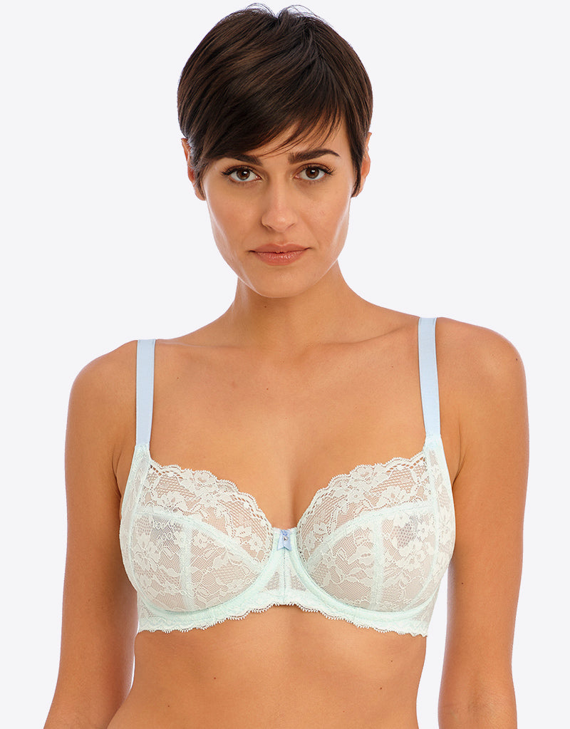 Freya's stunning Offbeat side support bra is here in Pure Water - a pastel dream of pale blues in all-over lace cups. The side support shape boasts a laminated 4-part cup that gives your bust great forward projection and uplift, while stretch lace top cups offer an ease of fit that's perfect for those with full-on-top shapes or asymmetrical breasts.