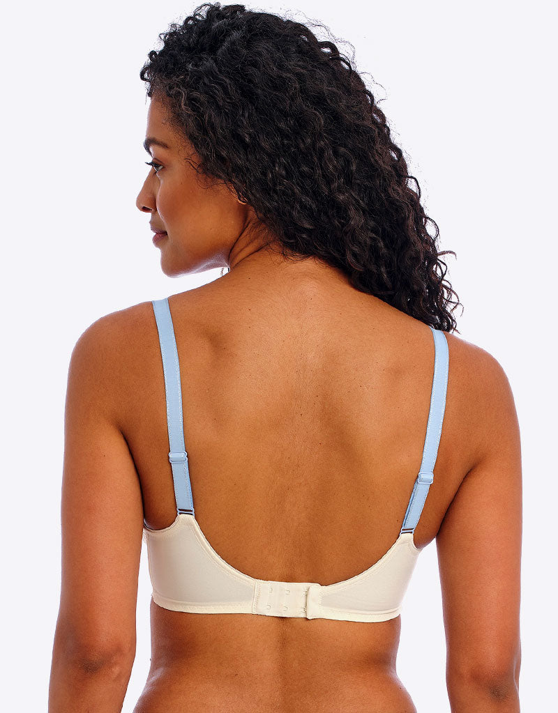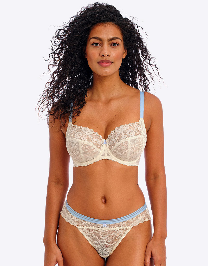 Get the perfect bridal bra for your wedding day with the Freya Offbeat side support bra in Something Blue. This gorgeous balcony bar is made from soft floral lace in a warm ivory hue, with contrasting powder blue straps to be your Something Blue.