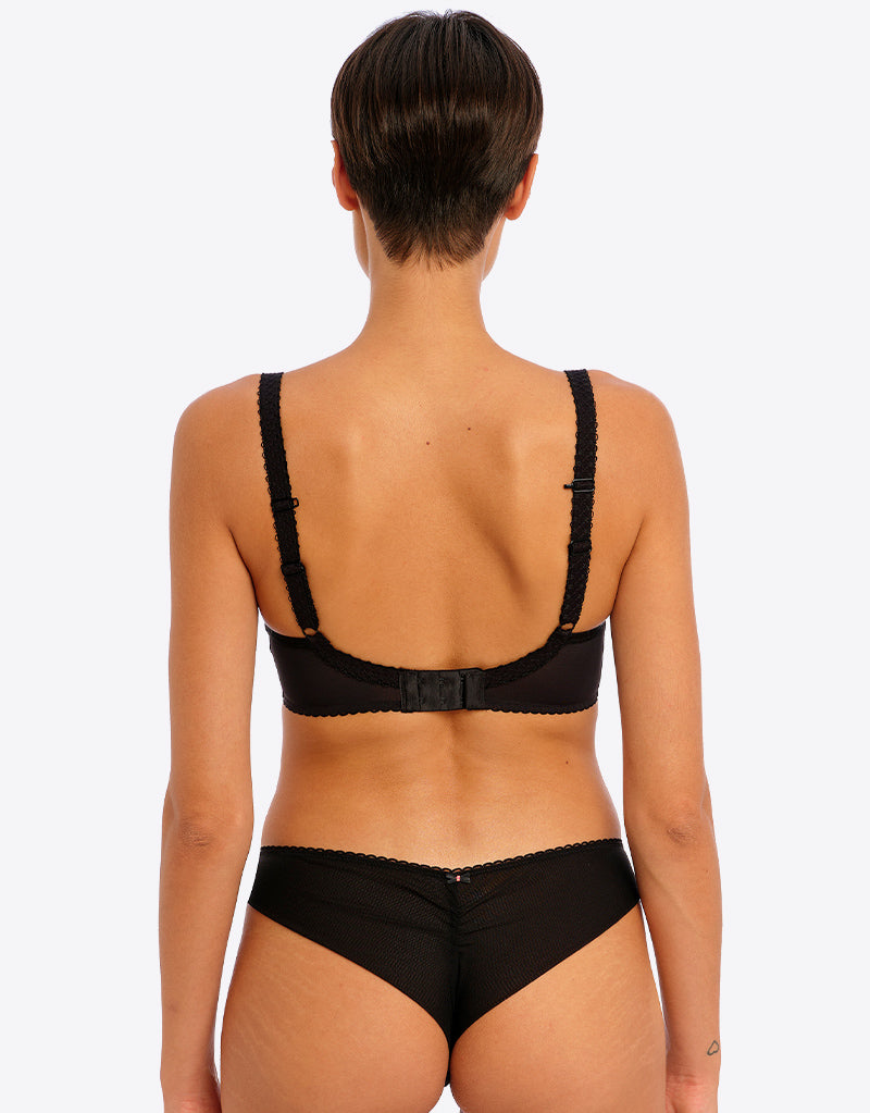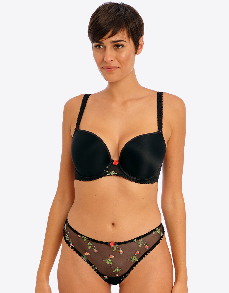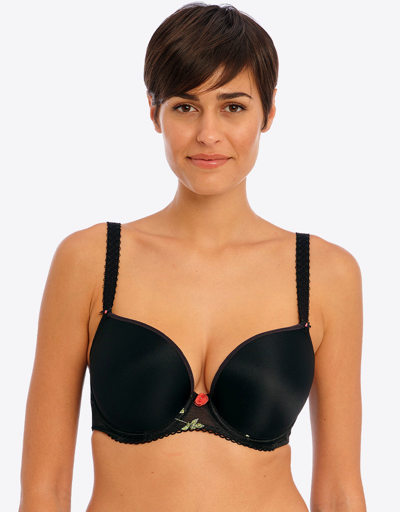 Everyday style just got cute with a pop of rose embroidery in Freya's Rose Blossom moulded plunge t-shirt bra. This black colourway is perfect for under your day to day outfits with a smooth, seamless fit for great shape, highlighted by a rose embroidered panel at the centre front and picot elastics.