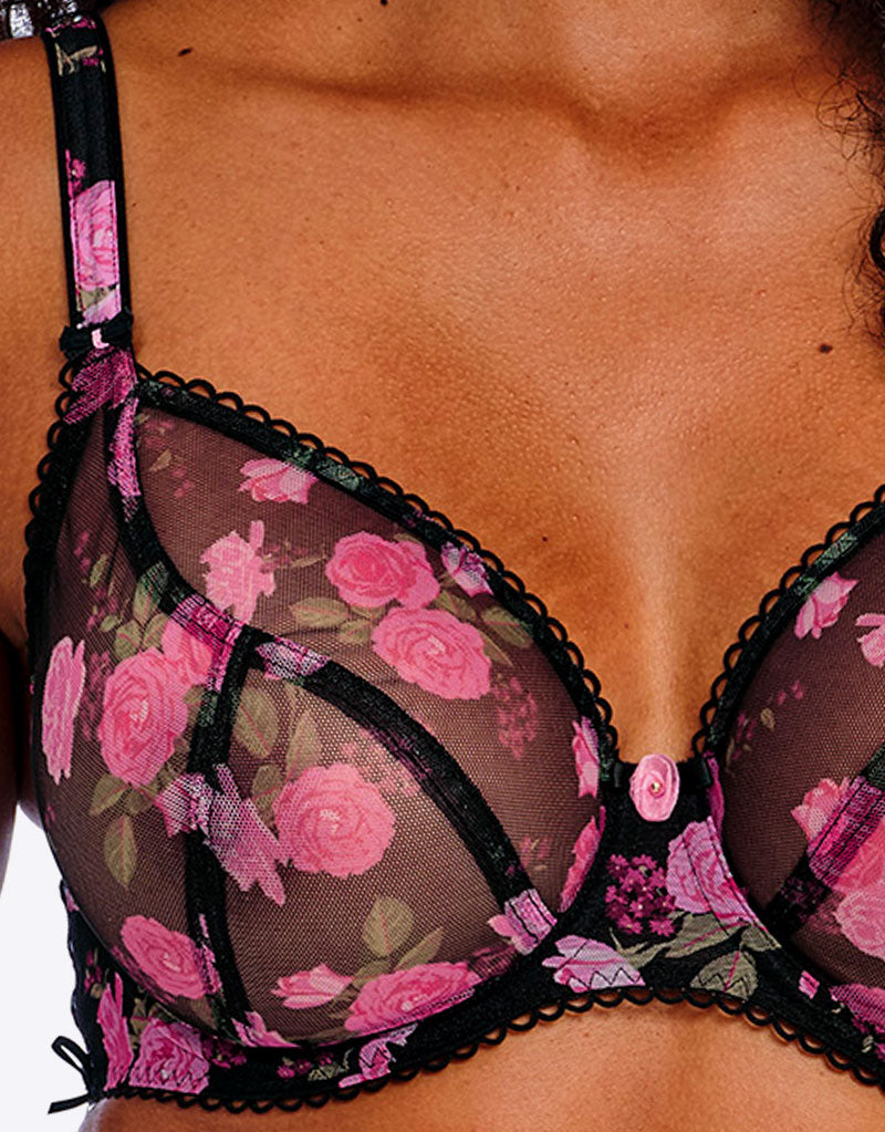 Exude femininity with the Freya Rose Blossom plunge bra, in a pretty pink rose print on black mesh. This supportive and comfortable plunge bra is made from soft, sheer mesh with 3-part cups and a low neckline. Trimmed with picot elastics and lace up ribbon detail at the sides.