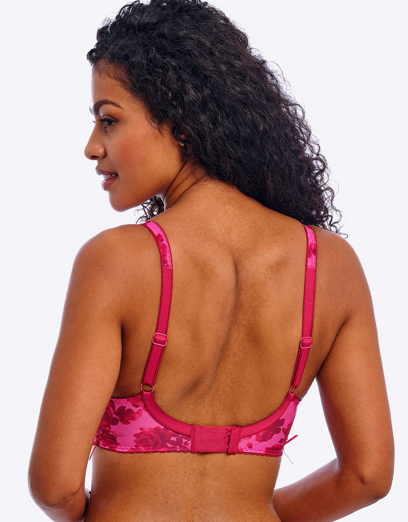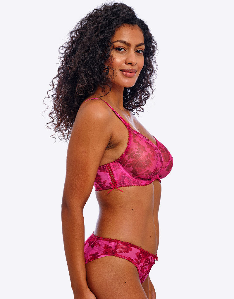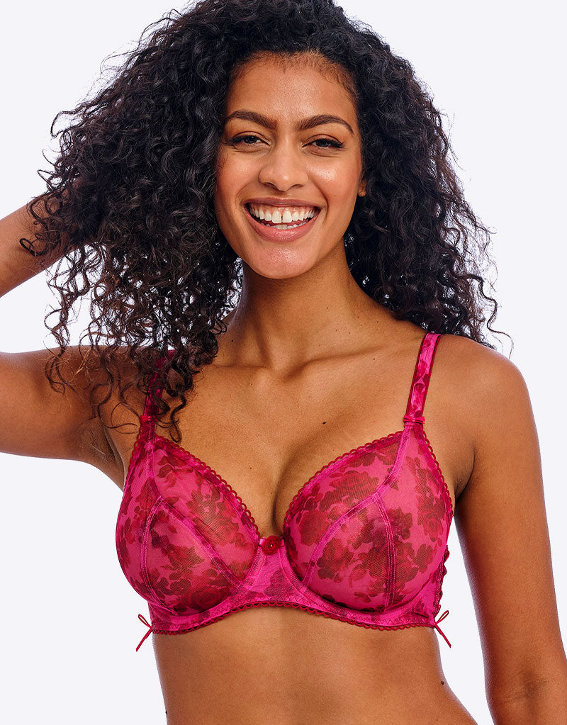 Freya's Rose Blossom plunge bra is here to unleash your femininity with its gorgeous red rose print. A supportive and comfortable plunge bra for everyday wear, made from soft sheer mesh with 3-part cups and a low neckline. Trimmed with picot elastics and lace up ribbon detail at the sides for a romantic feel.