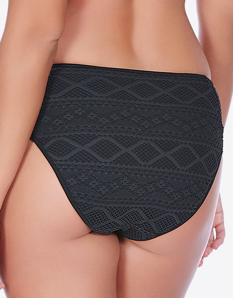 Effortless and easy to wear, it's the Freya Sundance bikini brief in timeless black. Crochet mesh makes for a chic, boho vibe, with a lined front and back panel to keep you comfortable and covered in a classic cut shape.