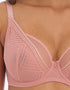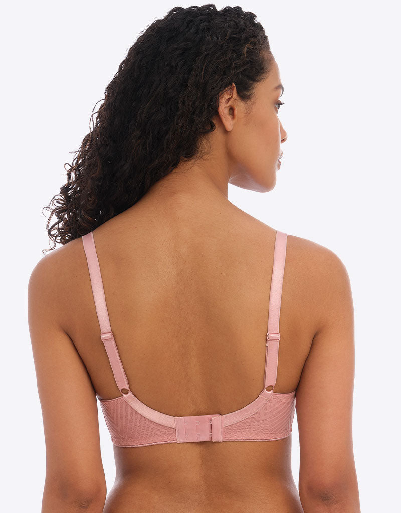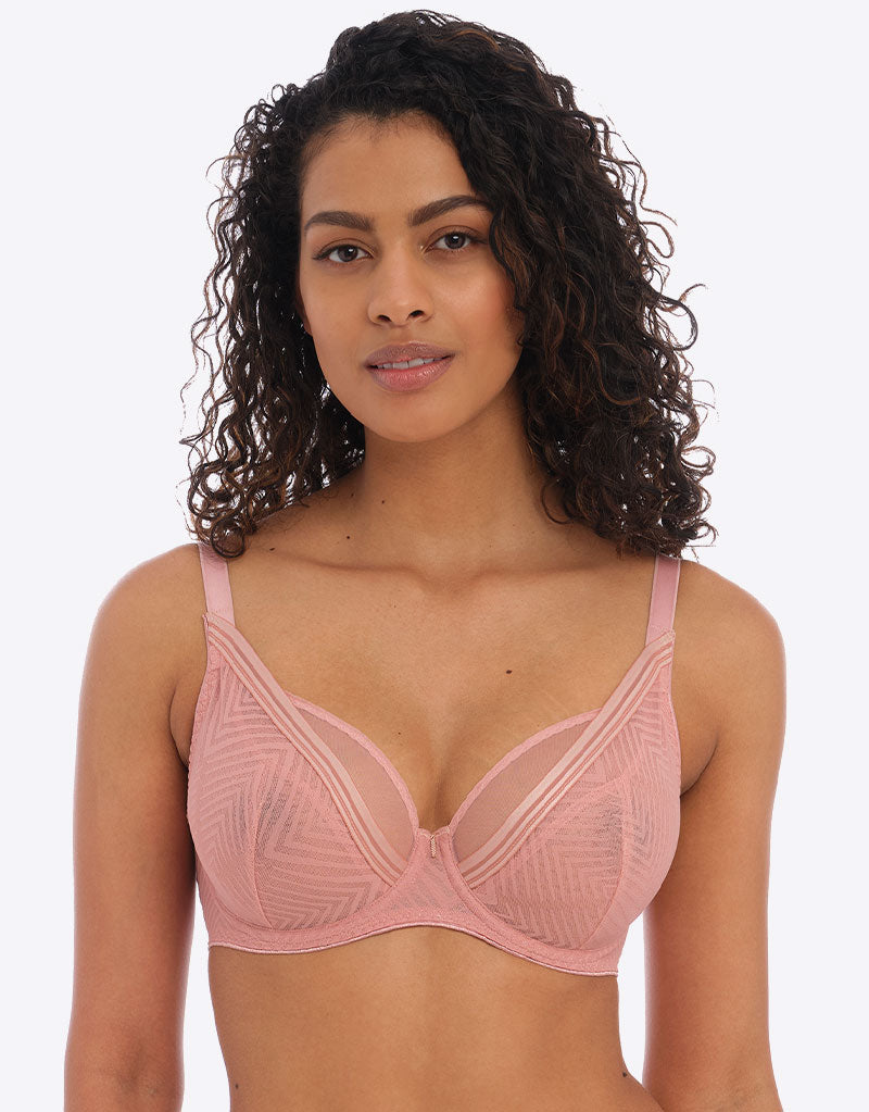 Freya's Tailored high apex bra is stunning in a demure ash rose pink. Double layered cups are supportive and well fitting, with an inner plunging 3-part cup design made in a rigid, semi-sheer mesh fabric. The outer layer is darted to shape, and made from a stretch geometric fabric that gives a smooth and flat finish.