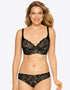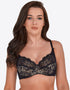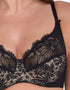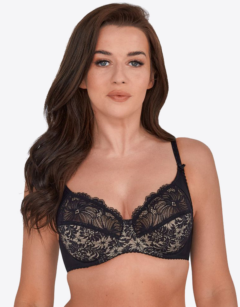 The Chantal balconette bra from Gaia lingerie is beautiful in black on a beige base, showcasing openwork lace for a decadent style. This balconette cut offers medium coverage in breathable fabrics for a lightweight and easy to wear style, with an adaptable fit thanks to the soft and flexible stretch lace top section.