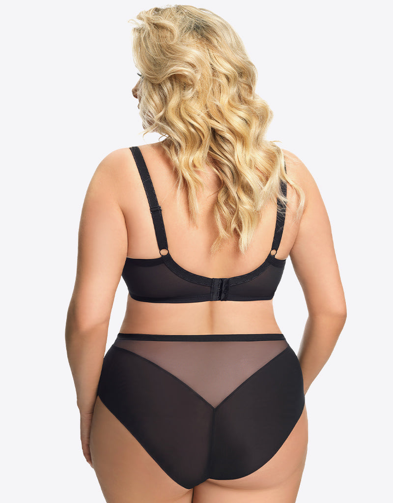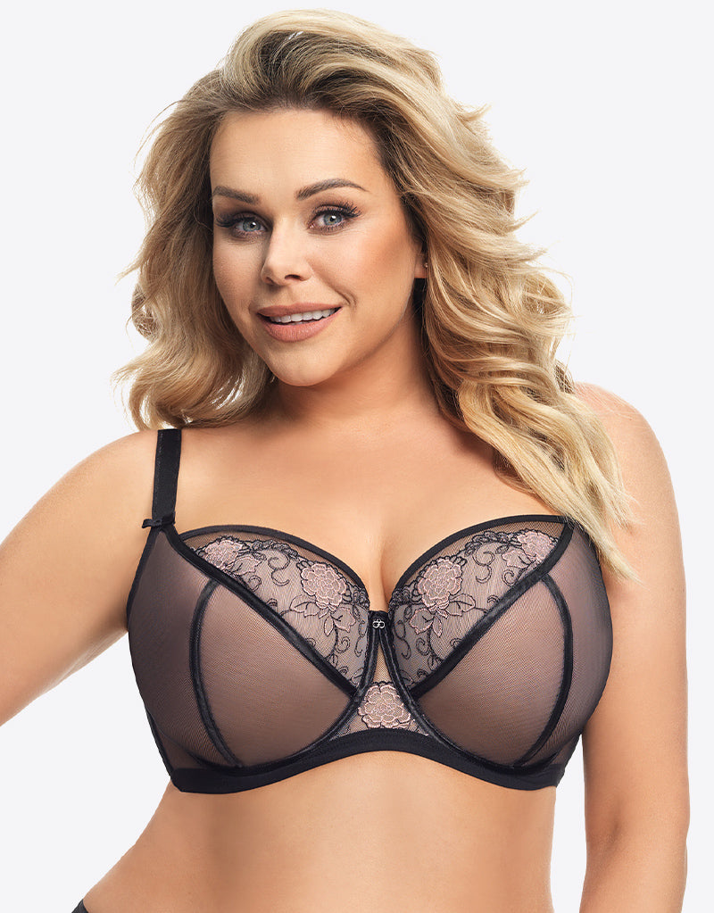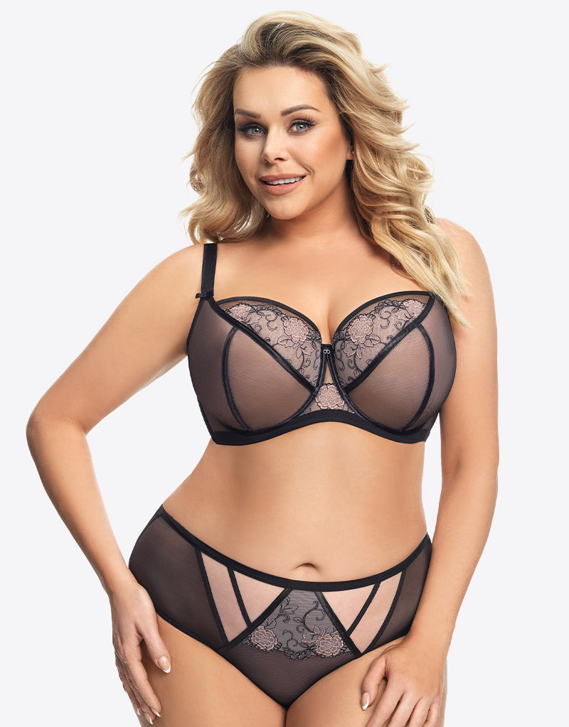 The Capri bra from Gorsenia is understated and chic in a simple sheer black mesh 3-part cup. Adorned with a black and pink floral embroidery panel to the top cup and satin effect binding on the seams for a luxe, pretty finish. The typical Polish bra shape fits narrow and projected to give a gorgeous, up-front shape to your bust.