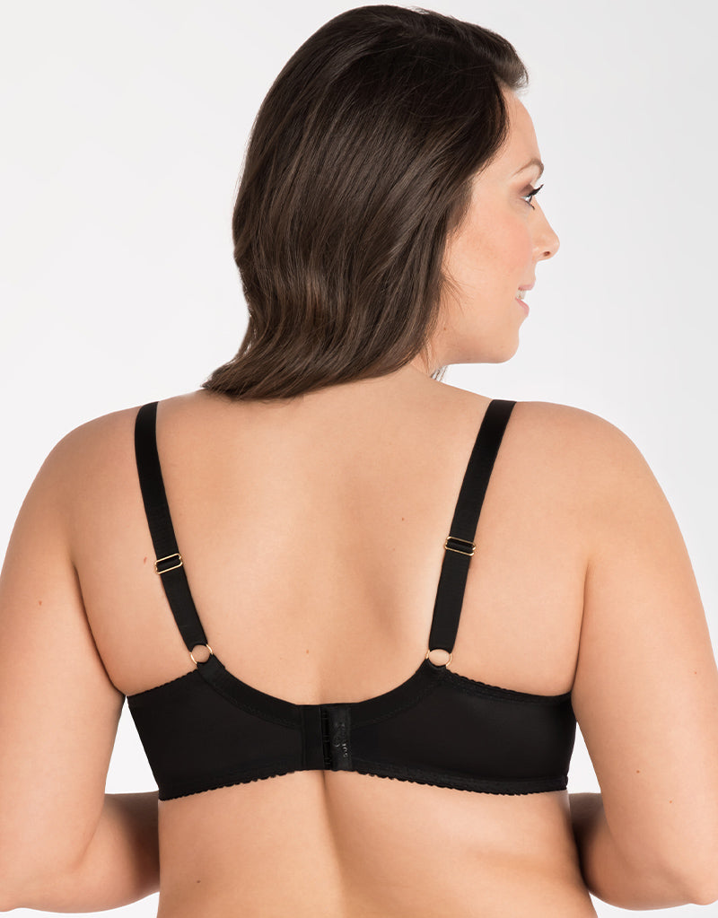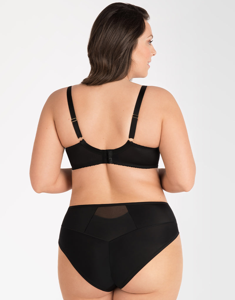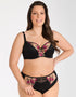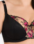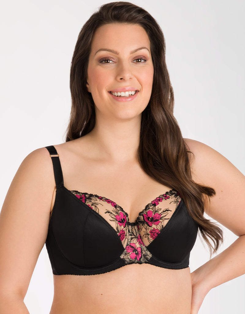 Gorsenia's Gaby balconette bra is beautiful in black, with bright pink floral embroidery detailing. 3-part cups and wide set straps offer an uplifting shape, with typical Polish narrow wires and forward projection. Finished with gold toned, nickel-free hardware and a supportive powermesh back band for all day hold.