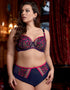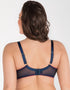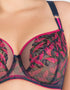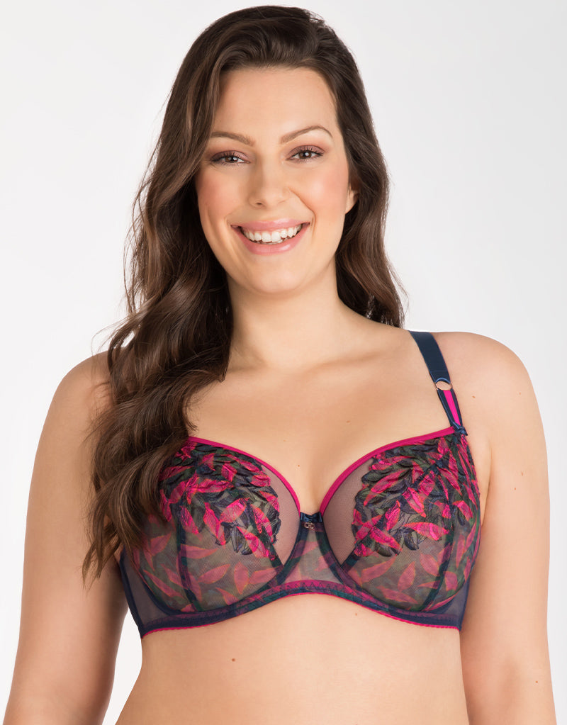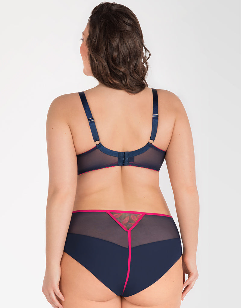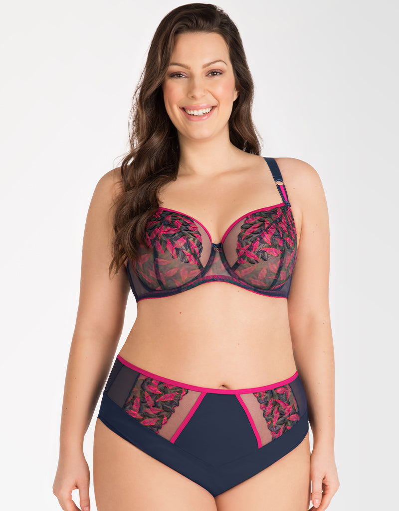 Gorsenia's Kayla balconette bra is beautiful in navy with pops of magenta in an intricate leaf design. 3-part, non-padded cups give fantastic shape with forward projection and uplift, in a stable and secure non-stretch mesh fabric. Designed to give medium cup coverage for everyday wear, with comfort and style in mind.