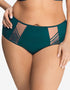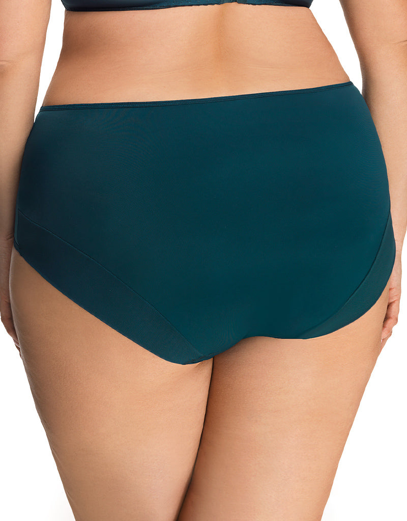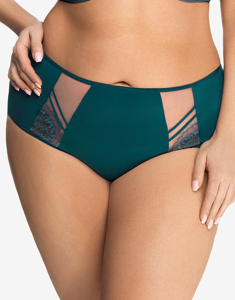 Complete your lingerie look with the Paradise brief from Gorsenia. Styled in soft microfibre with embroidered tulle panels to the hips, this mid-rise, moderate coverage brief is stunning in a deep emerald green hue.