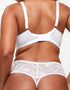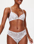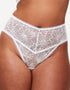 The KBX Alice deep thong is effortless and beautiful in a white floral lace. A deeper waistband offers a comfortable fit that feels modest and comfortable, with a classic thong back to reduce VPL with lower coverage. Finished with a brushed gold branded charm to the the centre front waistband.