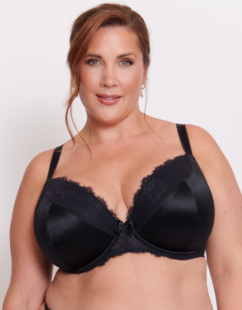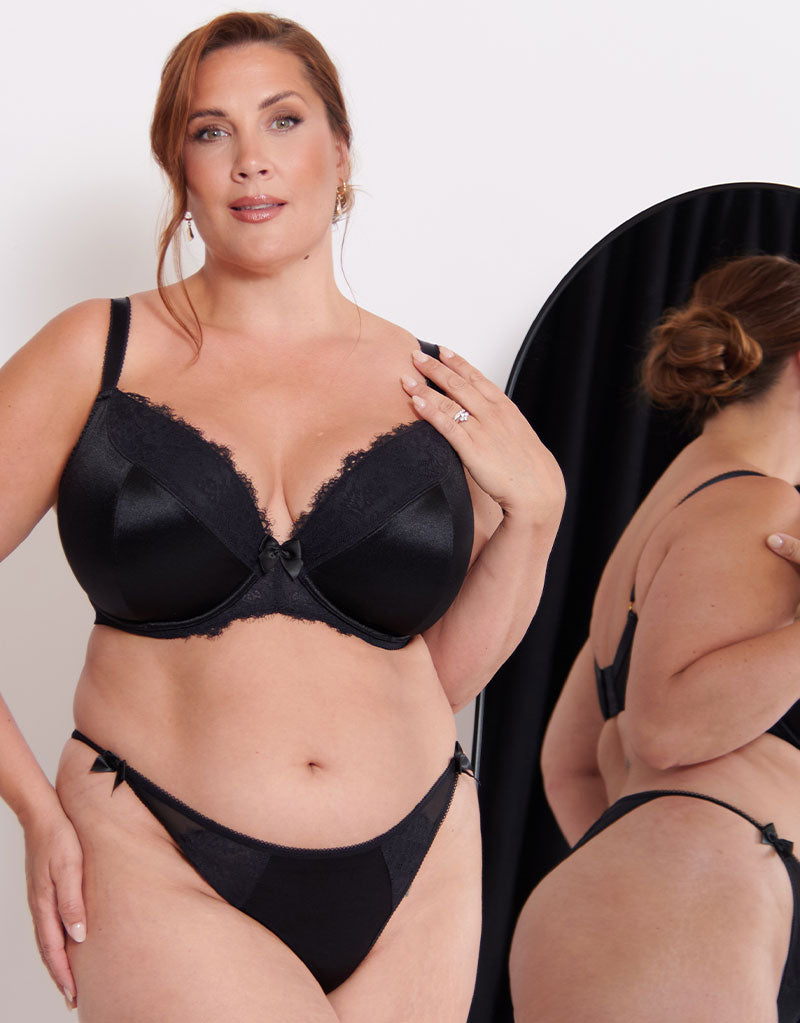 Meet Lisbon - a padded plunge bra in our gorgeous Liaison lingerie range. In timeless black, this stunning bra is subtly sexy in a satin-esque fabric, trimmed with lace to the top cups and cradle. A lower centre front offers less coverage without compromising support, giving day to night style with fuller bust and plus size comfort.