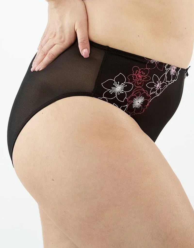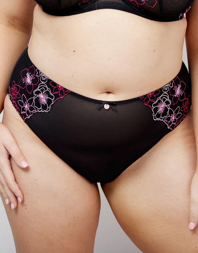 Oola Lingerie's Embroidery high waist brief is beautifully romantic in soft black mesh with pink embroidered florals to each hip. The high rise shape is comfortable and sits high on the hip with good front and back coverage.
