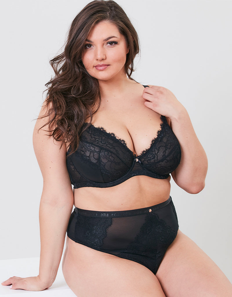Oola's Lace & Logo balcony bra offers the perfect everyday shape, with moderate coverage in a non-padded 3-part cup shape. The timeless black colour makes it easy to wear, and is made from soft mesh and lace with embossed logo straps for a modern feel.