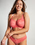 The Panache Allure brazilian brief in Coral brings a welcome pop of sophisticated colour and style to your knicker drawer. This low rise knicker sits comfortably on your hip, with less bum coverage and elegant detailing with lace made from recycled fibres.