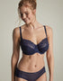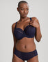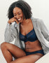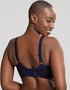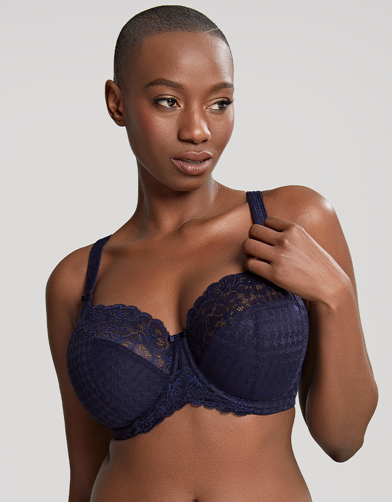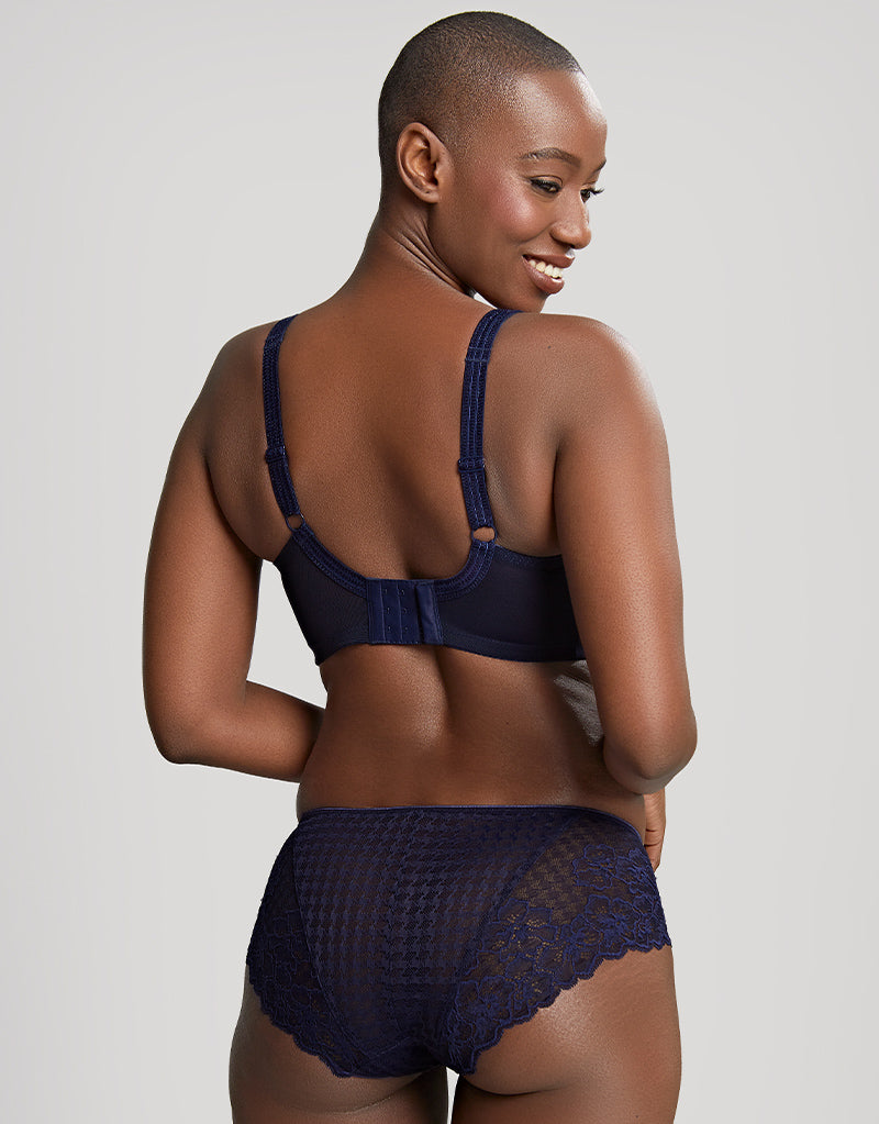 The navy blue of the Panache Envy balconette bra is sophisticated and luxurious. With a houndstooth jacquard fabric adding light texture to the sectioned cups, and pretty stretch lace to the top cups ensuring a perfect fit. Decorative bows to the gore and apex add the finshing touches and bring it all together.