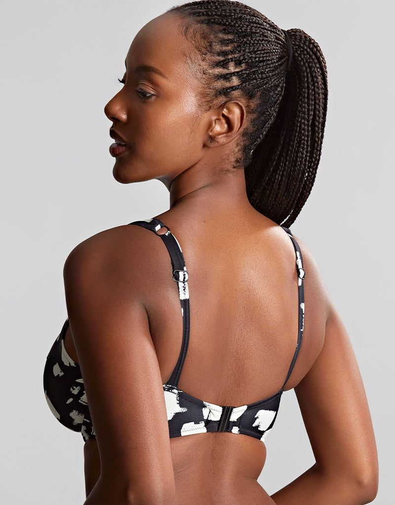 Style it out on the beach or poolside with the Olivia full cup bikini top from Panache. This chic Black Sand colourway offers a modern twist on classic black with off-white abstract print to break up the look, and is made from premium swimwear fabric for a luxe feel. Fuller coverage cups are underwired to give superb support and uplift, with built up front straps for comfort.