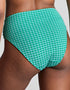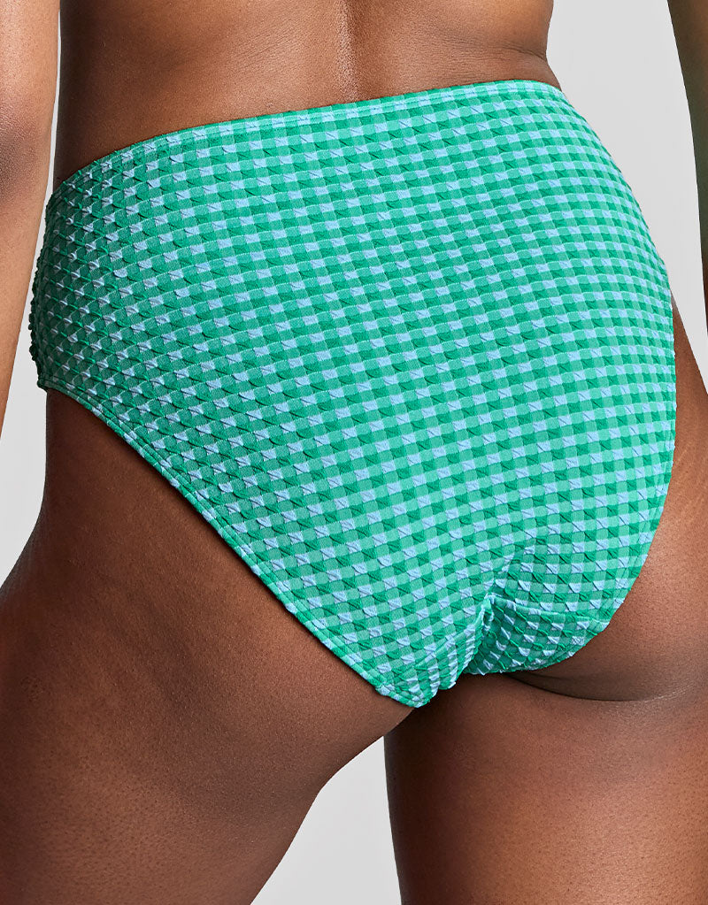 The Panache Olivia midi bikini brief is super cute in a green gingham print. Premium textured fabric with recycled yarn content feels soft and luxurious on the skin, cut in a mid-rise waist for a comfortable fit. Finished with gathered waistband detail for flattering effect.