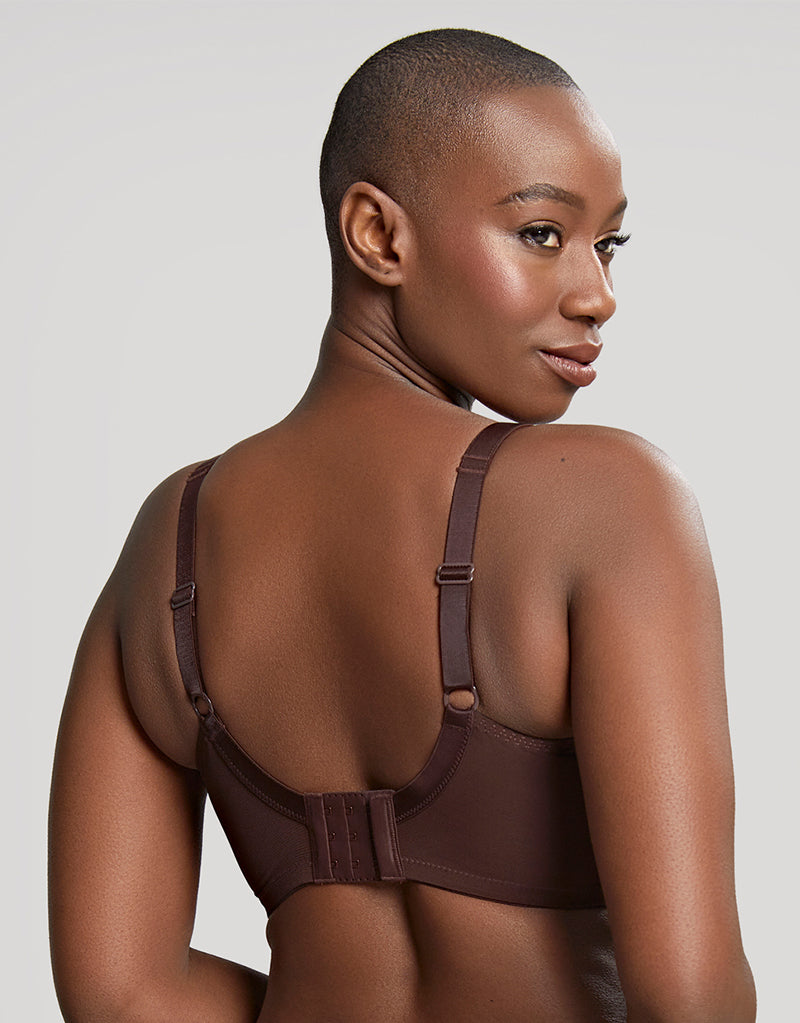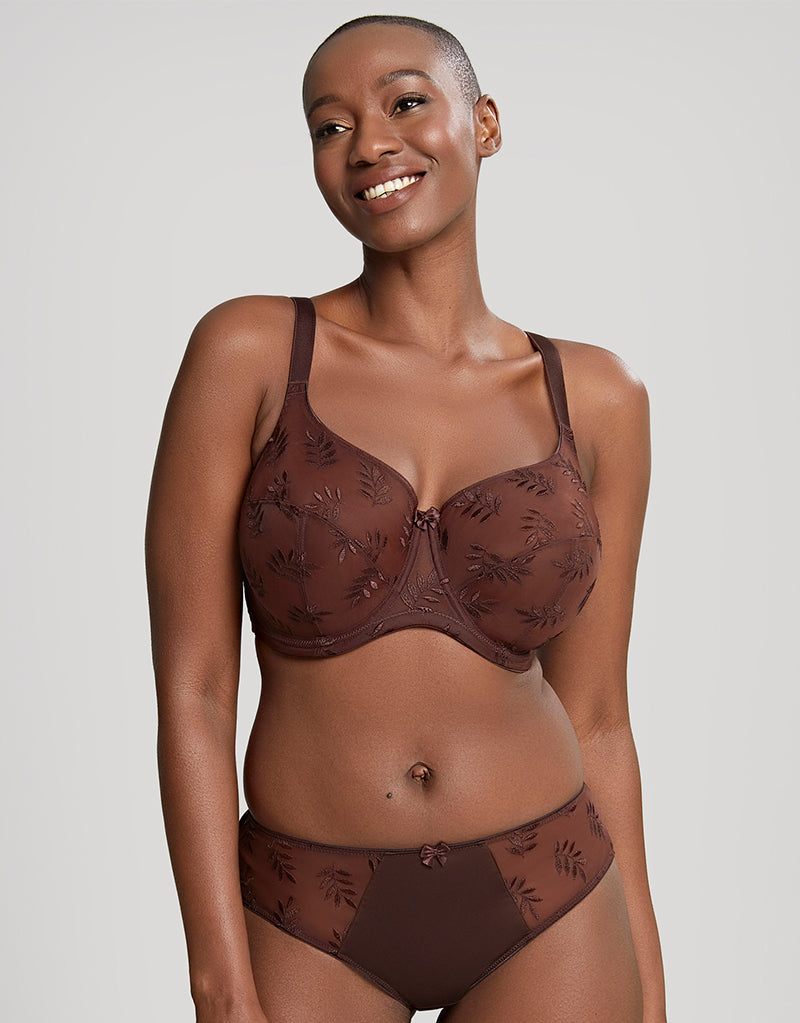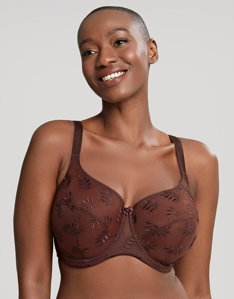 Meet Panache Tango Nutmeg - a rich brown hue in this bestselling, classic fuller bust bra. Tango is a staple piece in every bra-drobe thanks to its projected 3-part cups, supportive laminated fabric and pretty Austrian leaf embroidery. The deep brown works well as a neutral, and especially as a nude for those with dark skin.