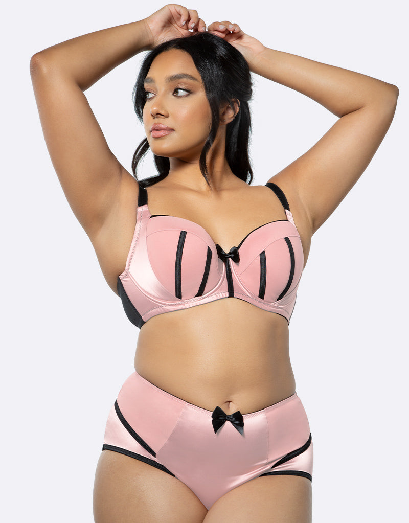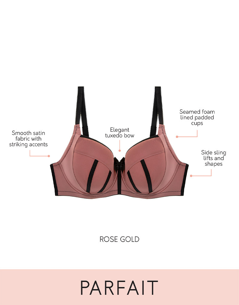 The Charlotte padded balcony bra from Parfait is gorgeous in dusty rose gold hue with black detailing. With a nod to vintage styling, the sleek matte cups meet satin detail to give a truly beautiful look, while the 3-part cups are foam lined to give a rounded and uplifted shape with optimum support. Outer slings to the cups helps project breast tissue forward for a streamlined silhouette.