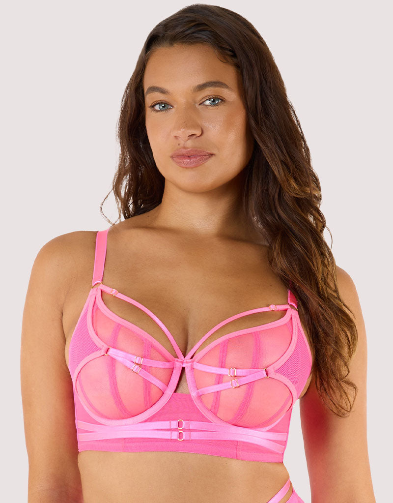 The iconic Playful Promises Eddie bra returns in a bold hot pink. The sheer, non-padded mesh cups with vertical seams shape and lift your bust, while crossover adjustable straps provide a bondage-esque feel. Designed with a longline band that offers added support and highlights your figure.